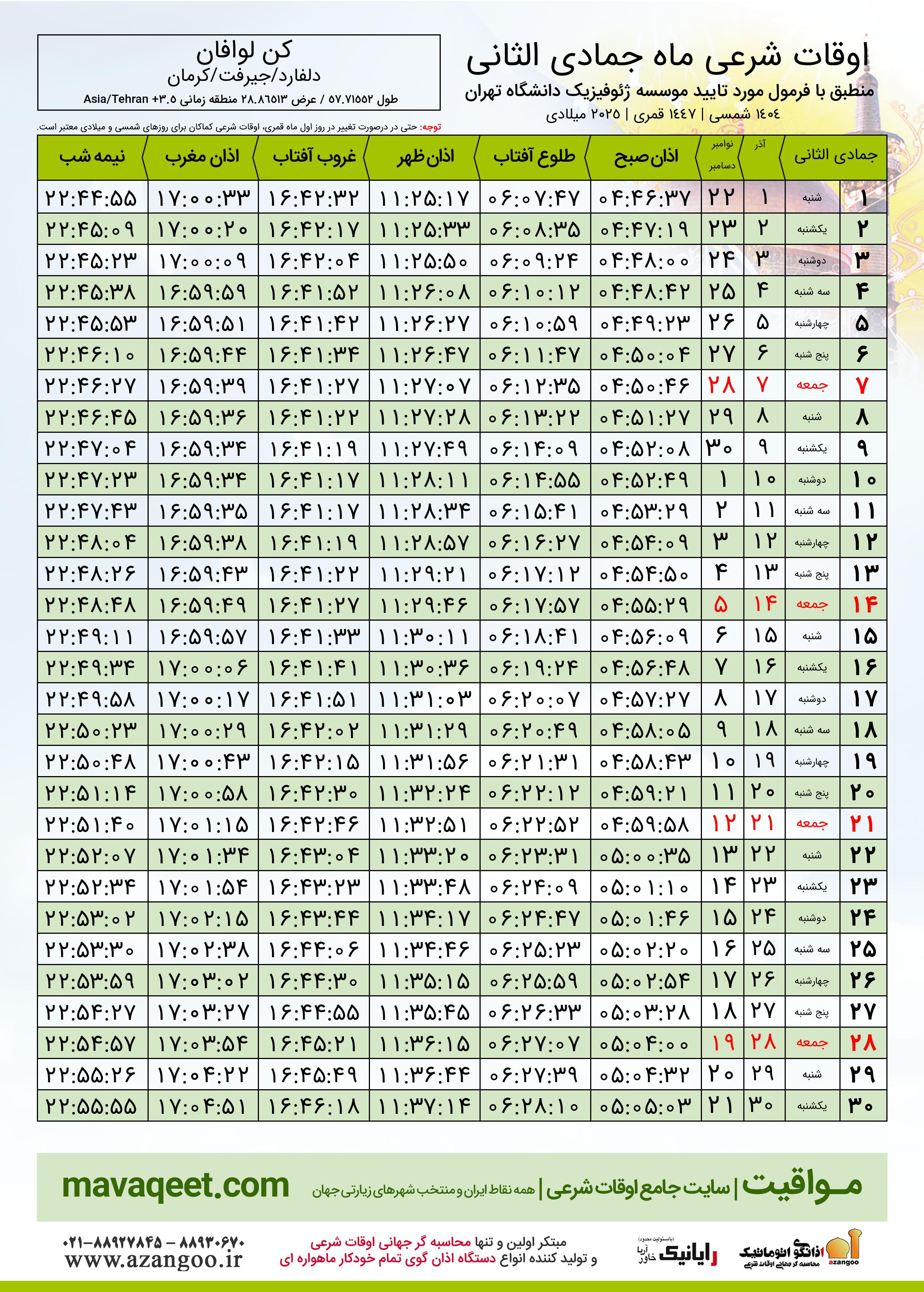 جدول اوقات شرعی جمادی الثانی ١٤٤٧ قمری روستای کن لوافان