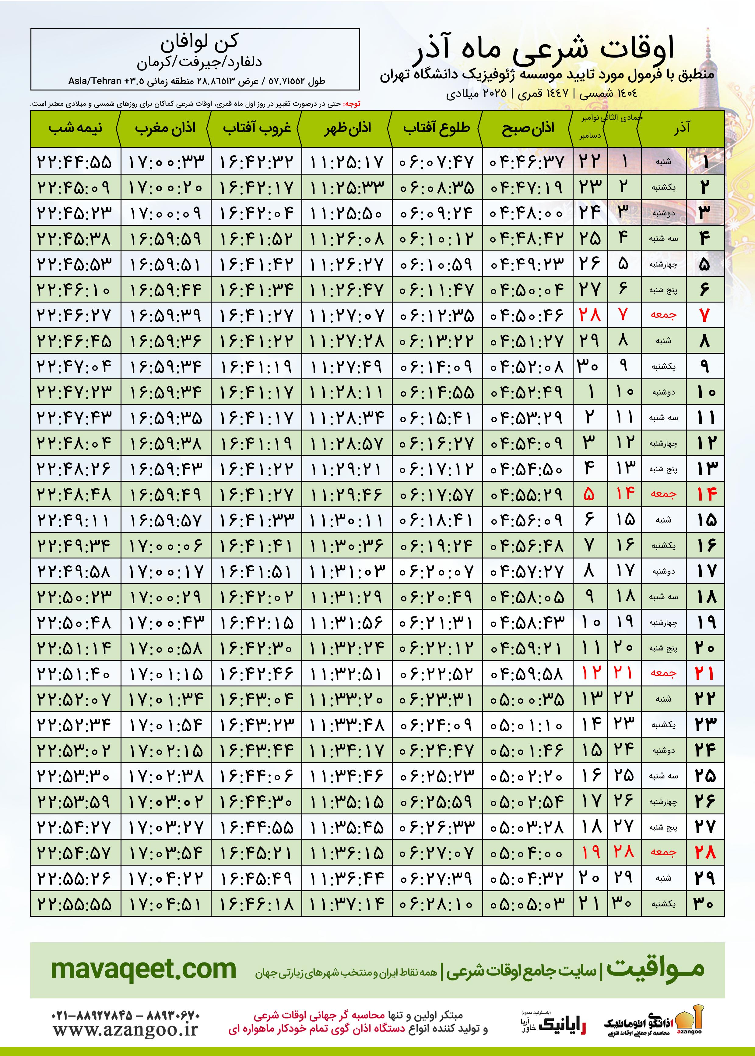 جدول اوقات شرعی آذر ١٤٠٤ شمسی روستای کن لوافان