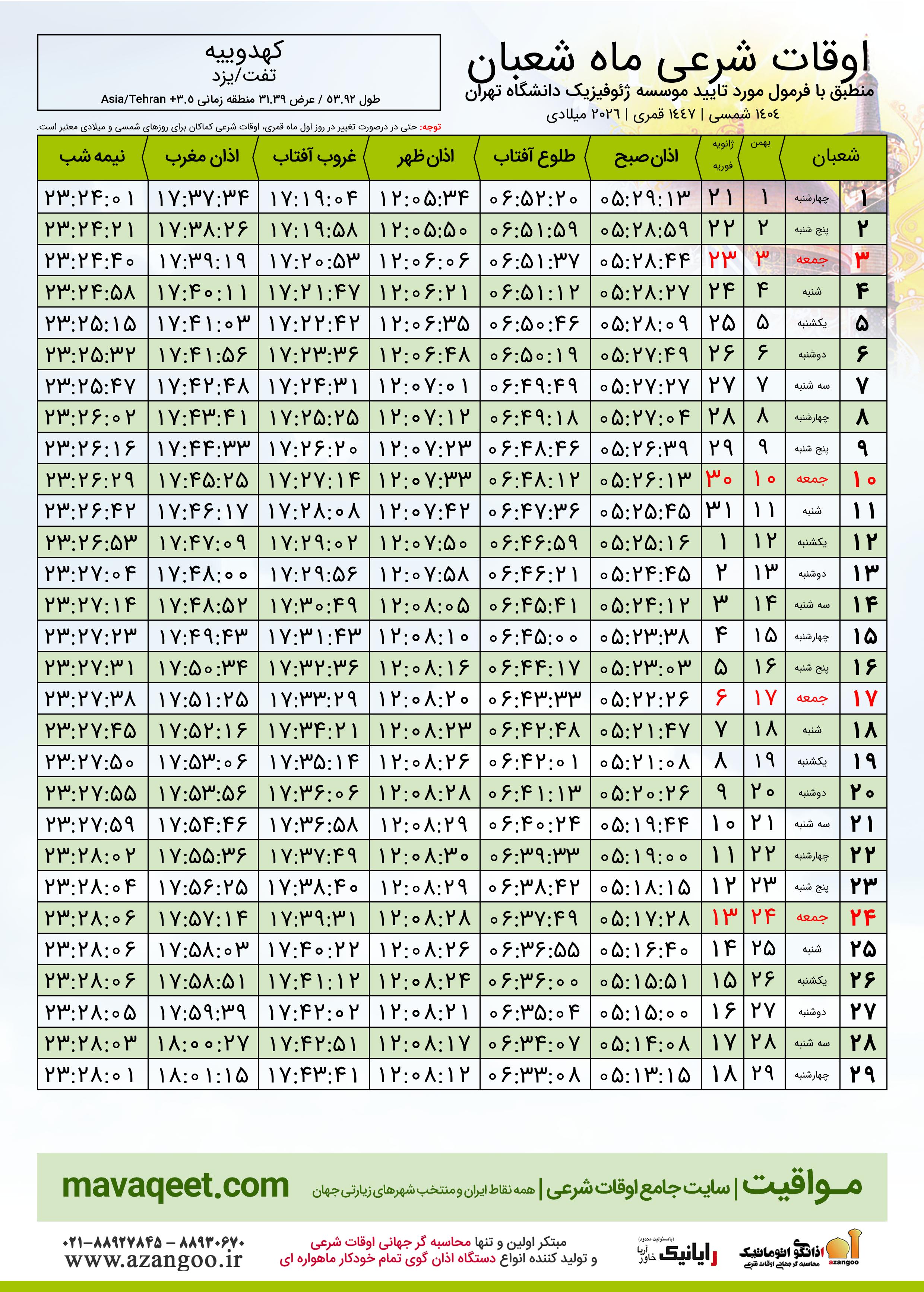 اوقات شرعی شعبان ١٤٤٧ قمری شهر کهدوییه