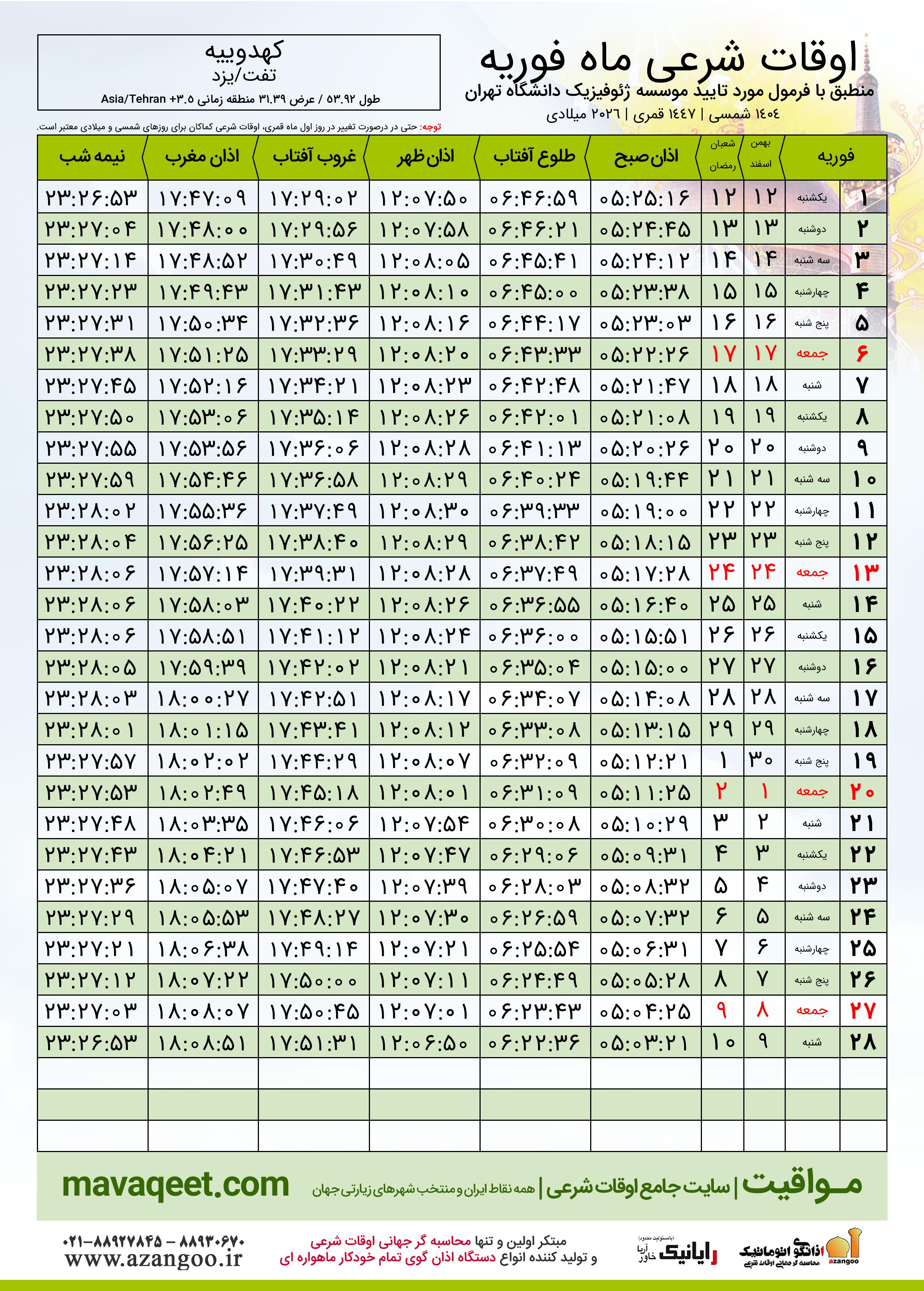 اوقات شرعی فوریه ٢٠٢٦ میلادی شهر کهدوییه