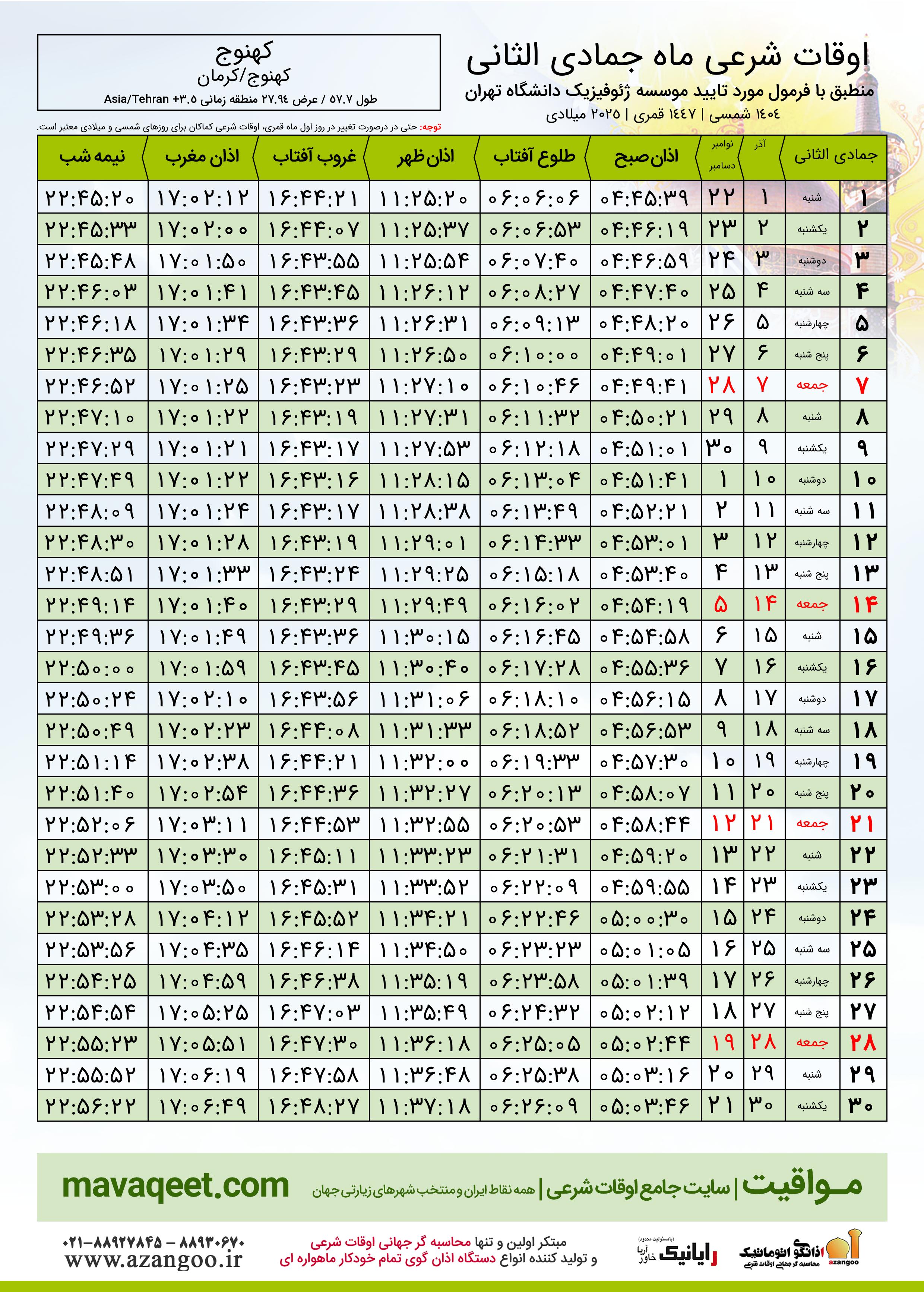جدول اوقات شرعی جمادی الثانی ١٤٤٧ قمری شهر کهنوج