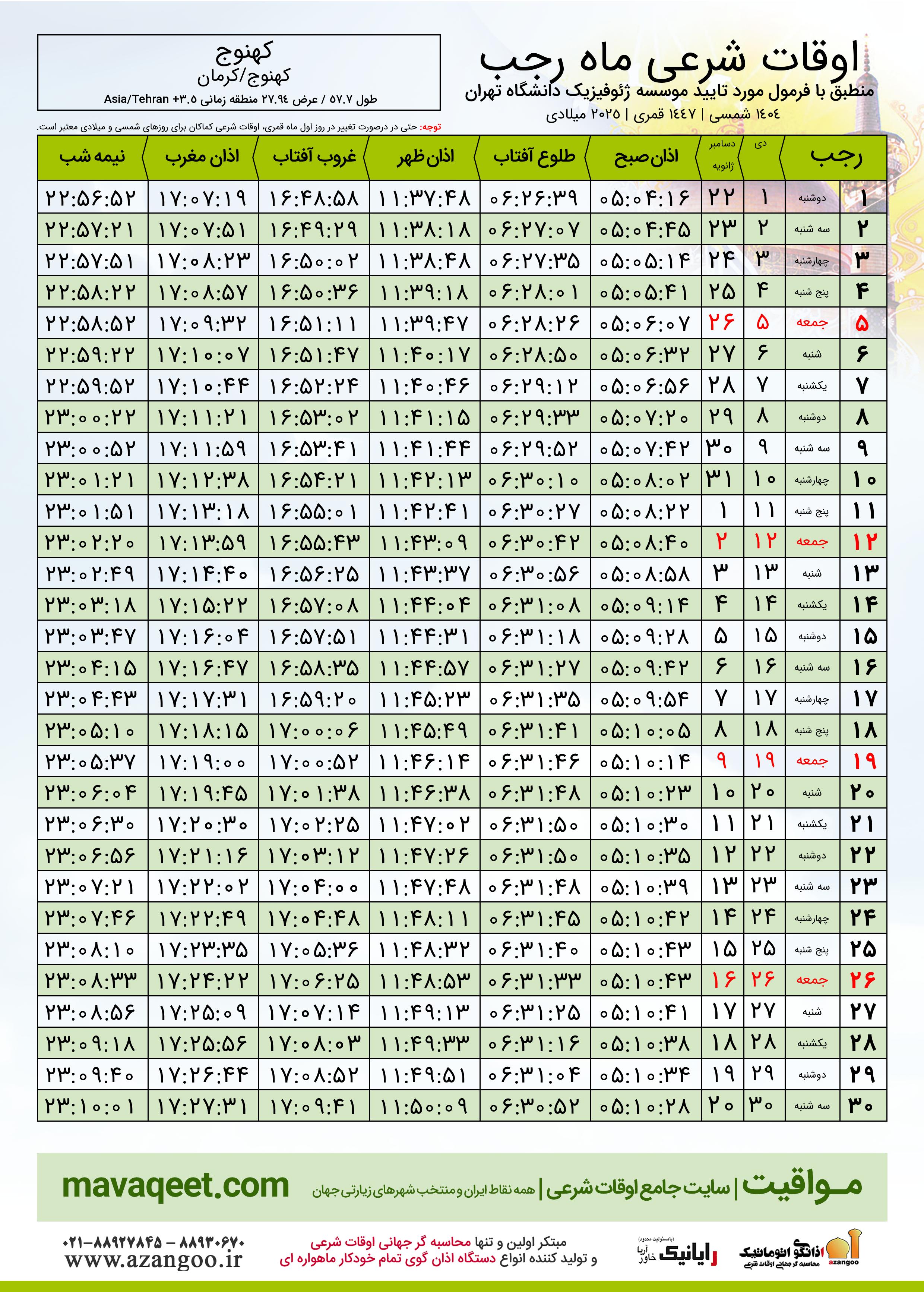اوقات شرعی ماه رجب ١٤٤٧ هـ.ق شهر کهنوج بر