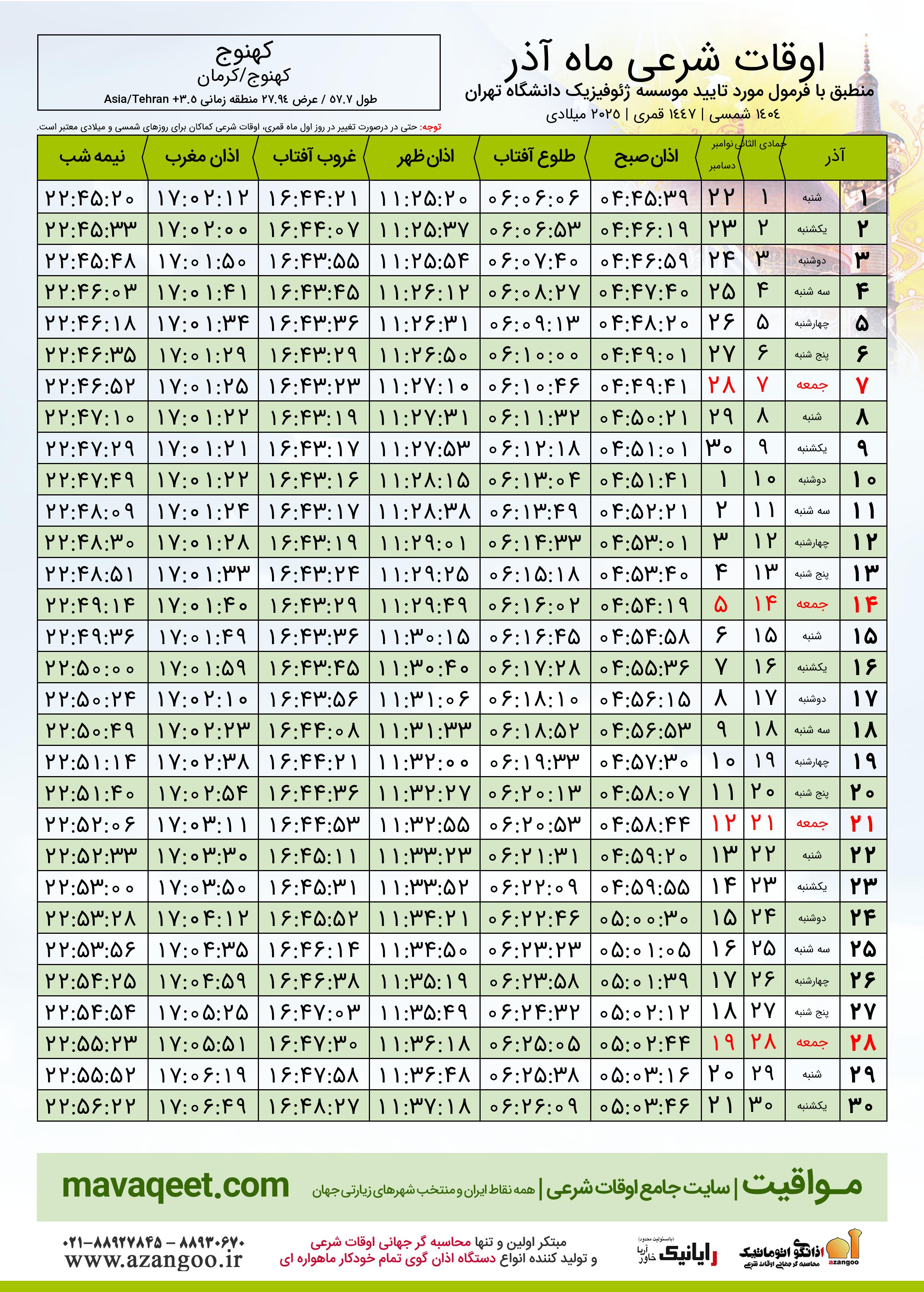 اوقات شرعی آذر ١٤٠٤ شمسی شهر کهنوج