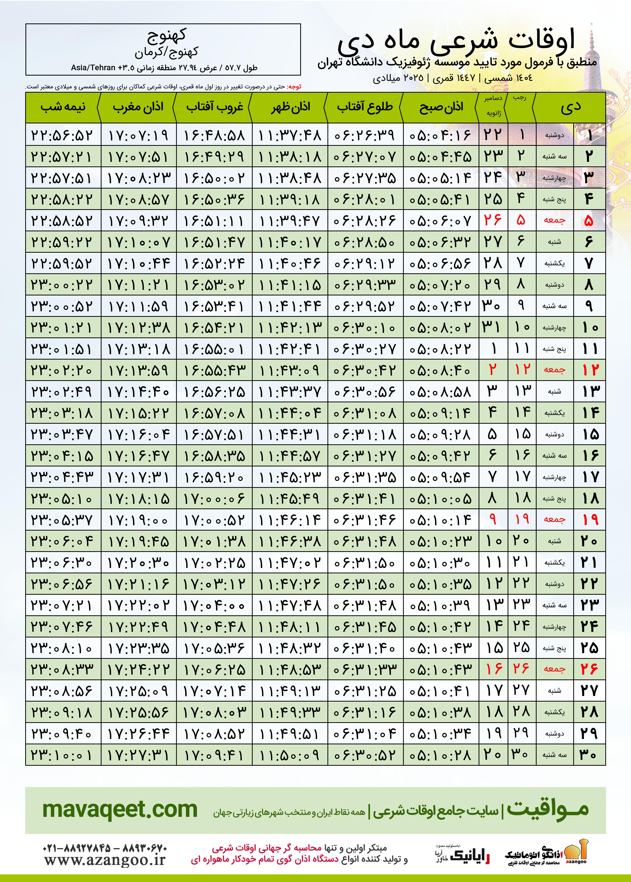 دانلود اوقات شرعی دی ٠٤ - ١٤٠٤ شهر کهنوج