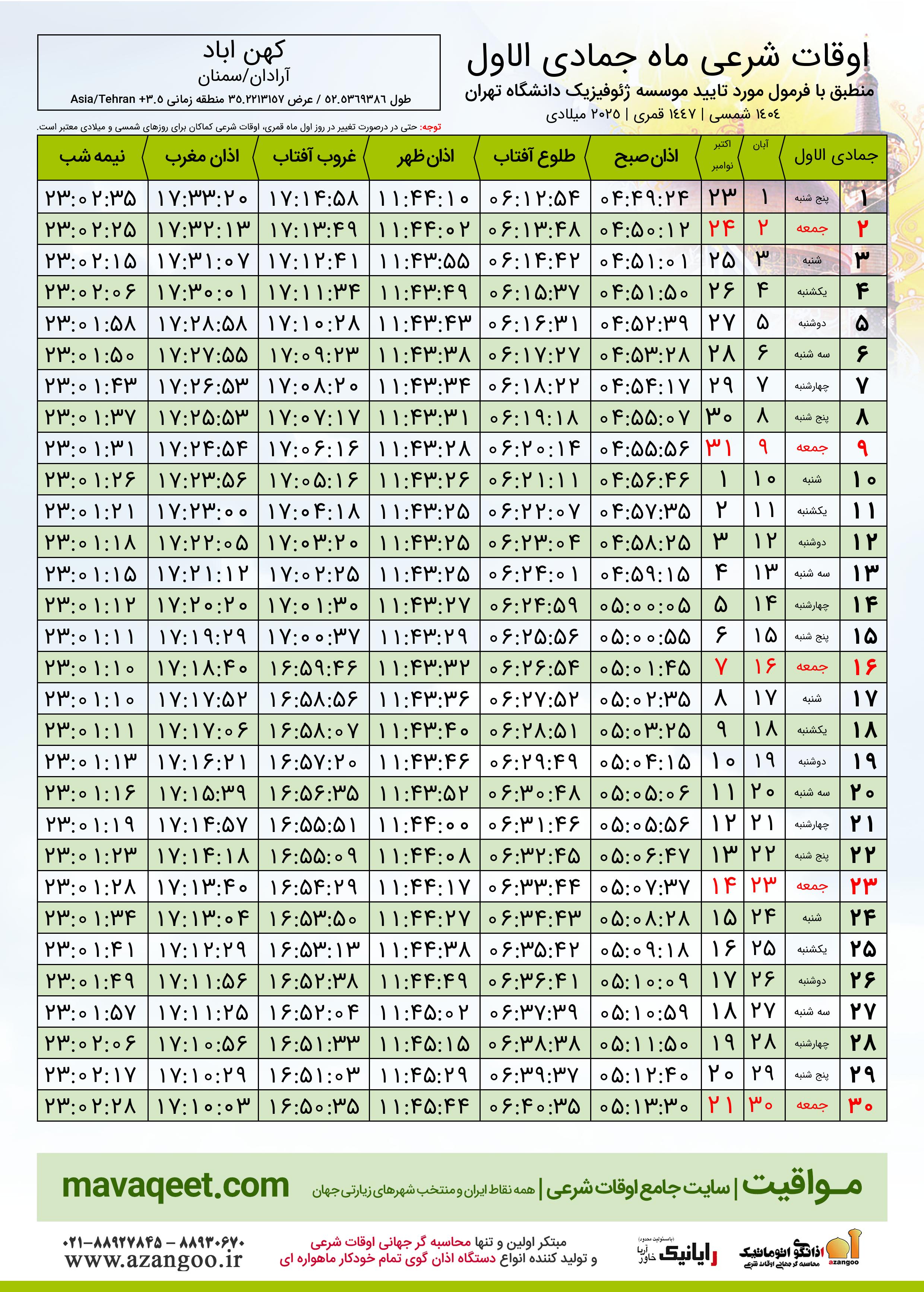 جدول اوقات شرعی جمادی الاول ١٤٤٧ قمری شهر کهن اباد