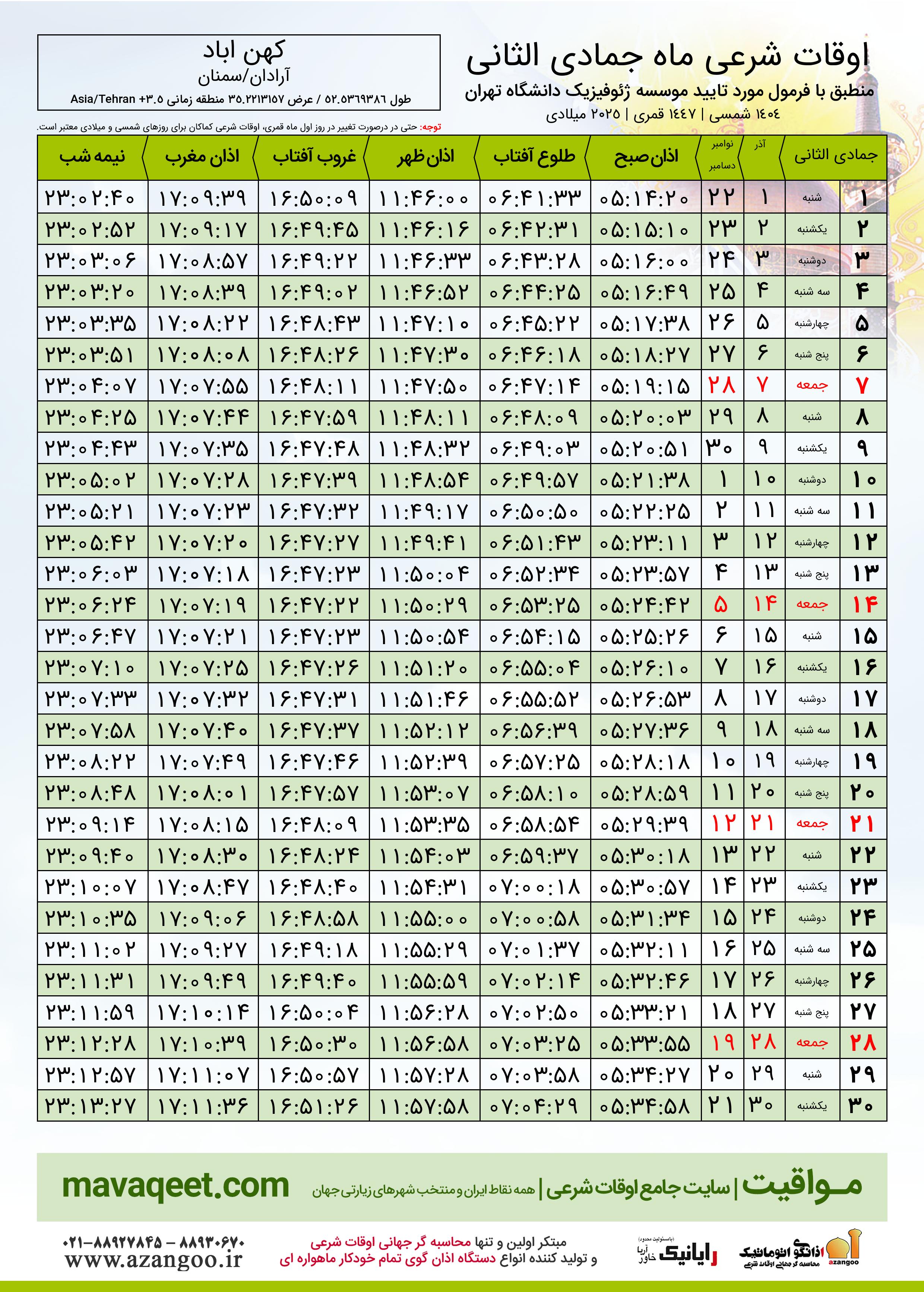جدول اوقات شرعی جمادی الثانی ١٤٤٧ قمری شهر کهن اباد
