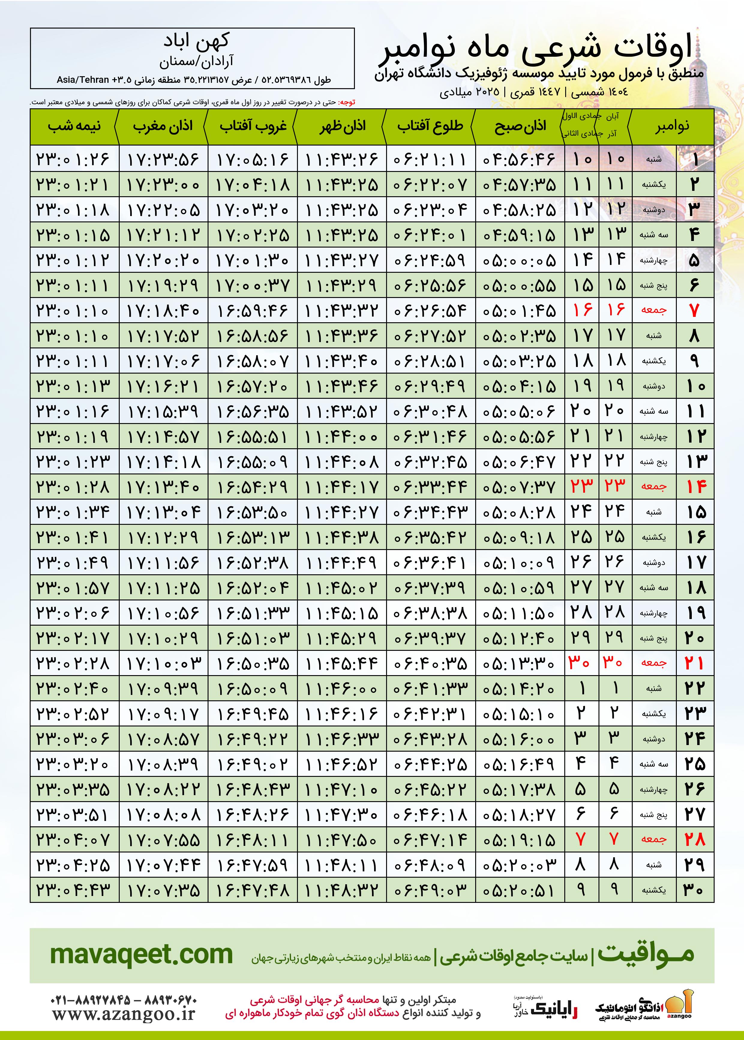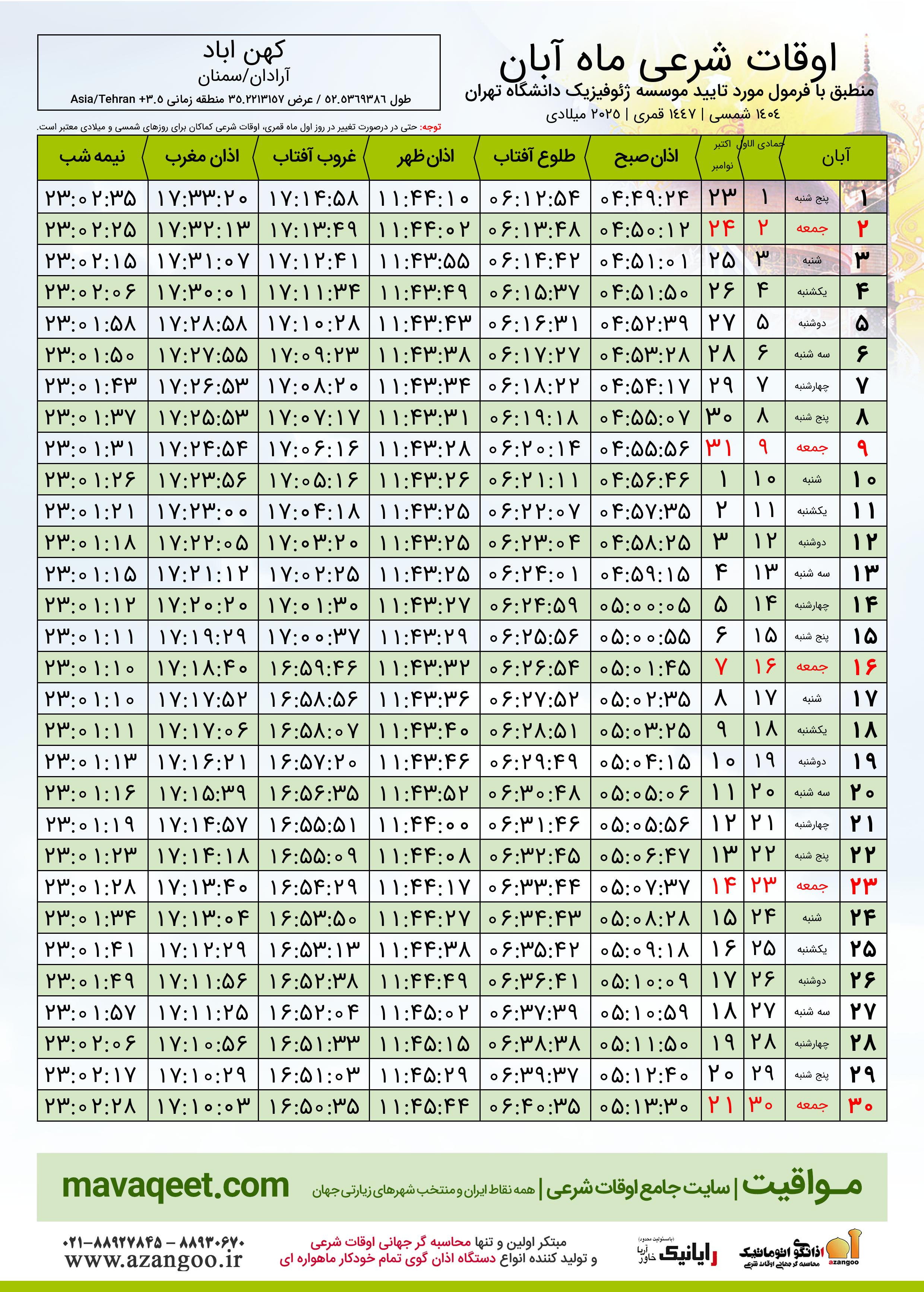 جدول اوقات شرعی آبان ١٤٠٤ شمسی شهر کهن اباد