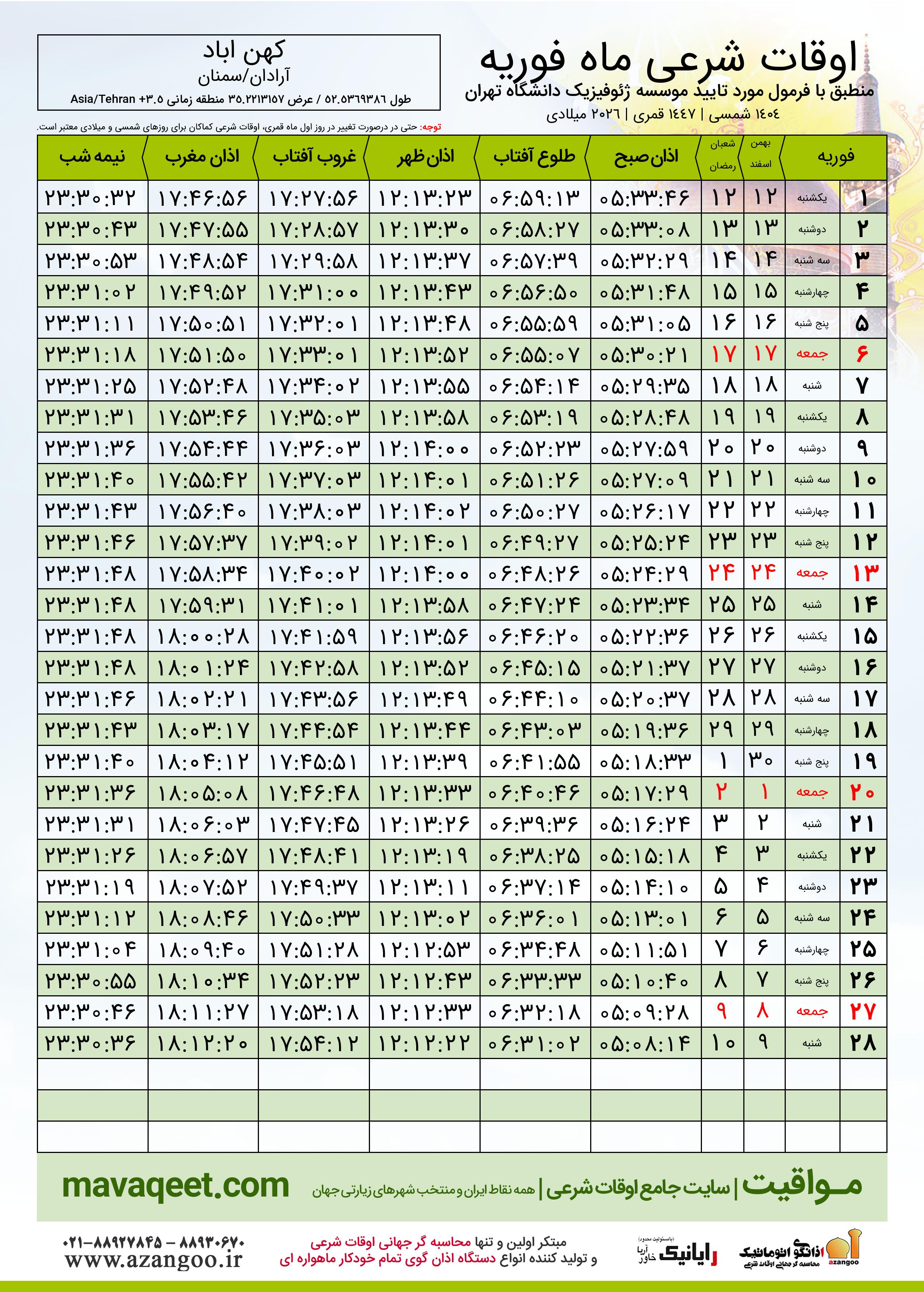 اوقات شرعی شعبان ١٤٤٧ قمری شهر کهن اباد