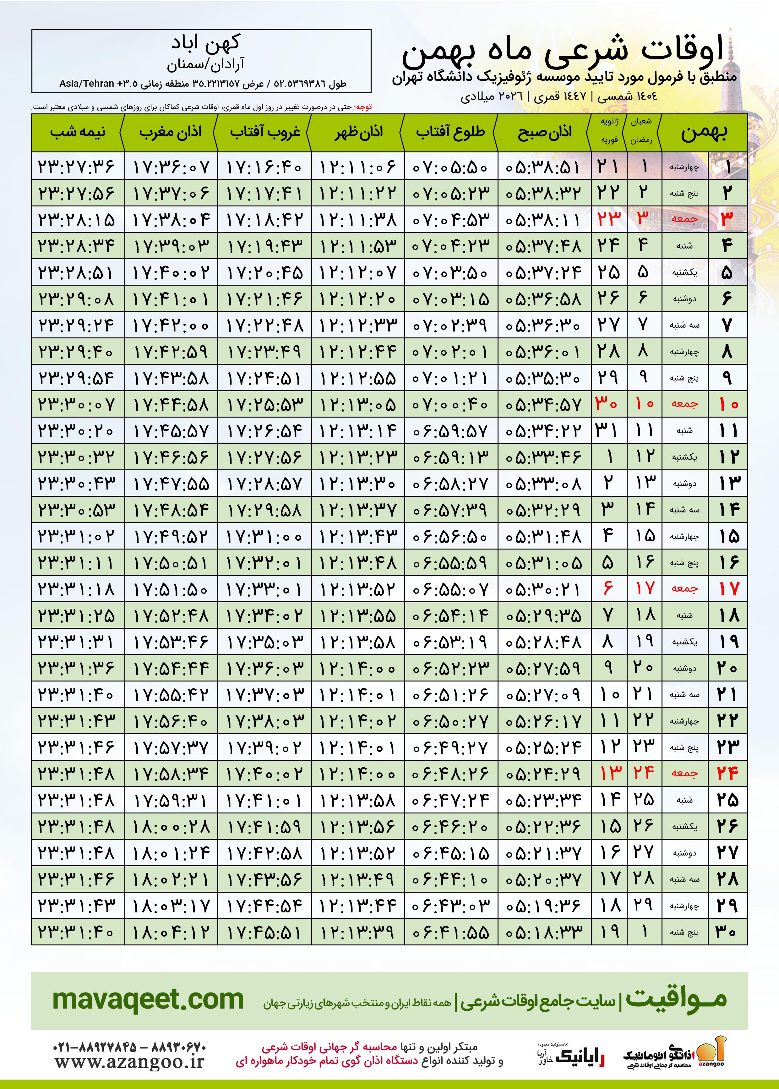دانلود اوقات شرعی بهمن ٠٤ - ١٤٠٤ شهر کهن اباد