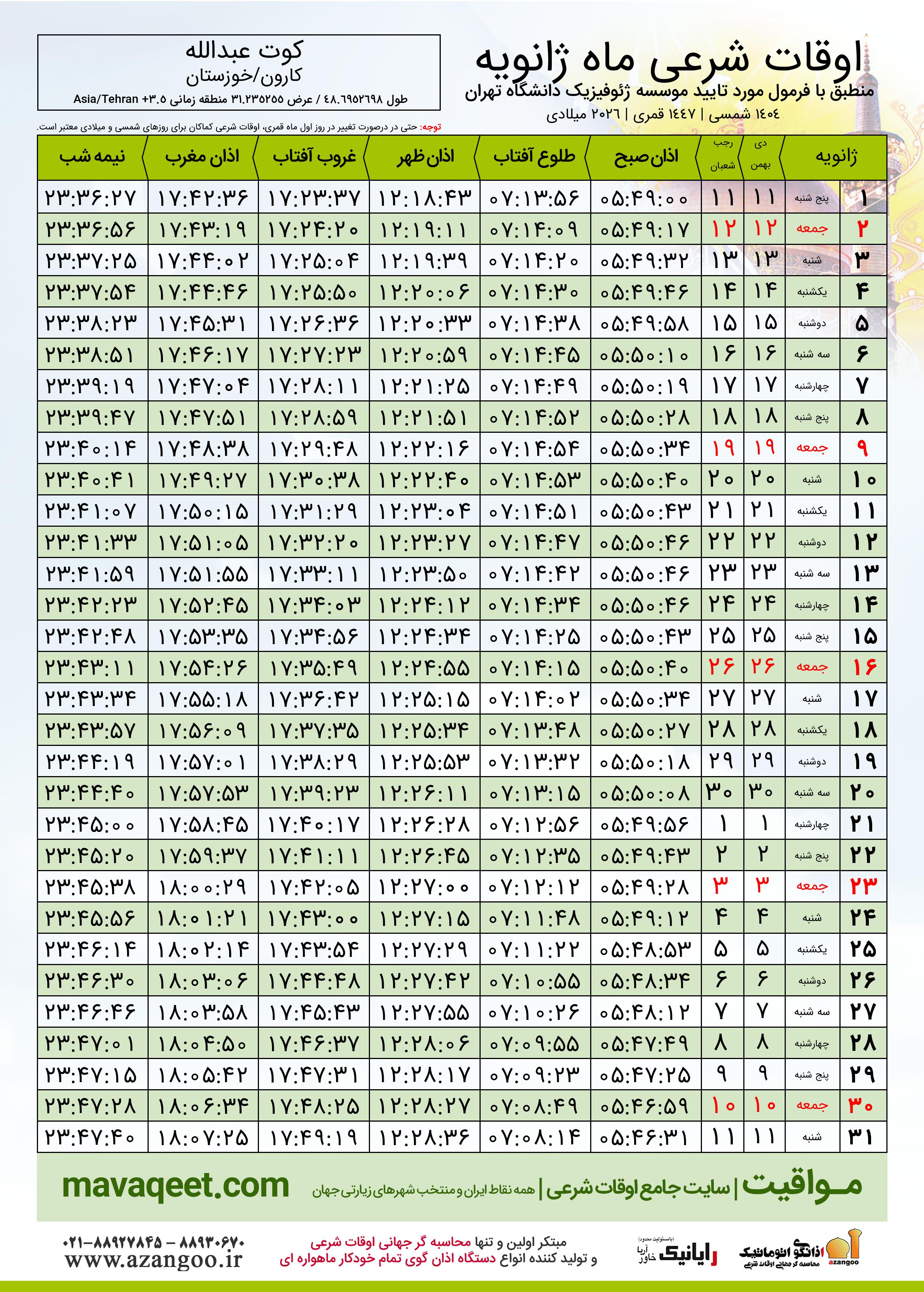 دانلود اوقات شرعی ماه رمضان ٠٤ - ١٤٠٤ شمسی | ٢٠٢٦ میلادی | ١٤٤٧ قمری شهر کوت عبدالله