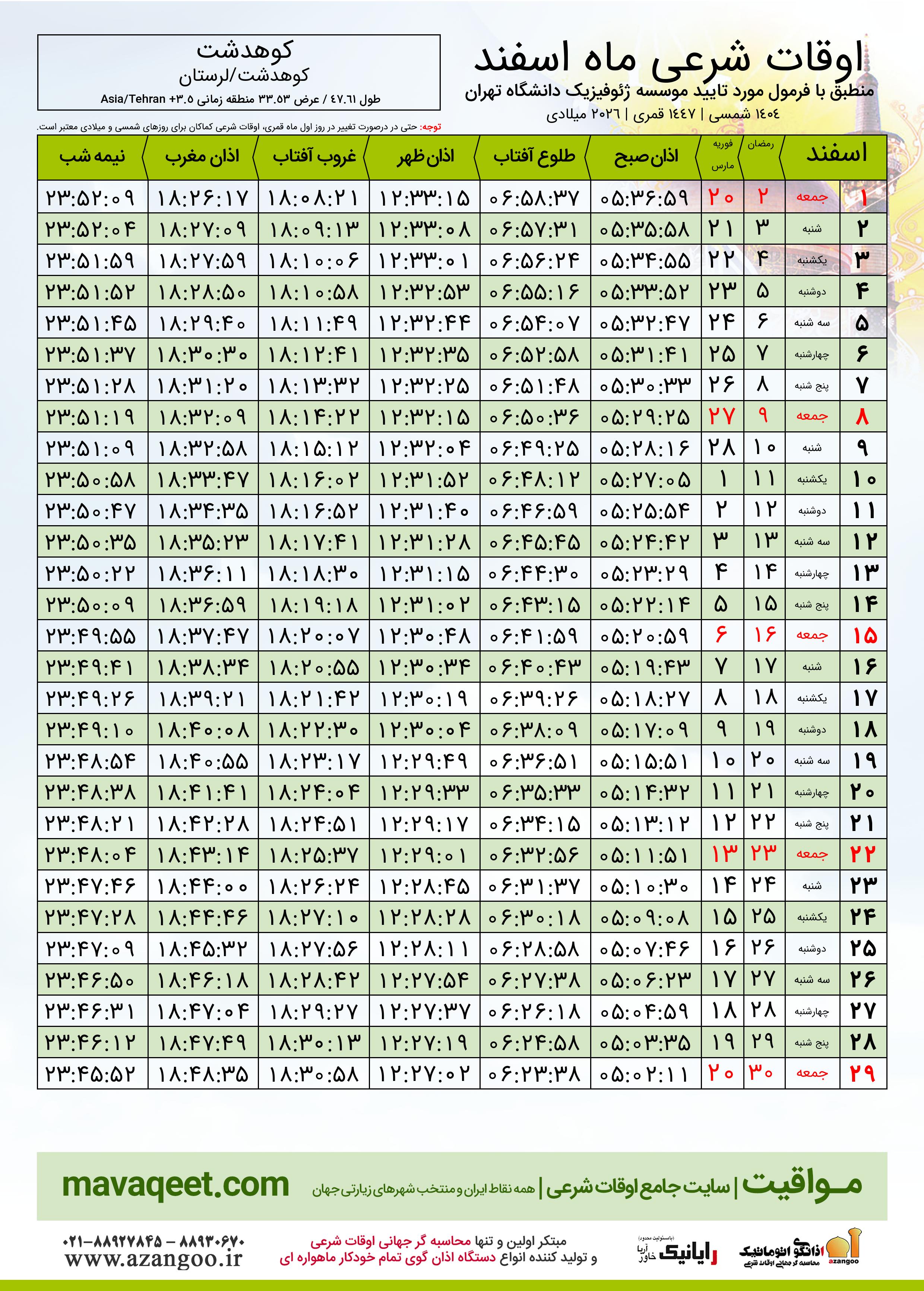 جدول اوقات شرعی رمضان ١٤٤٧ قمری شهر کوهدشت