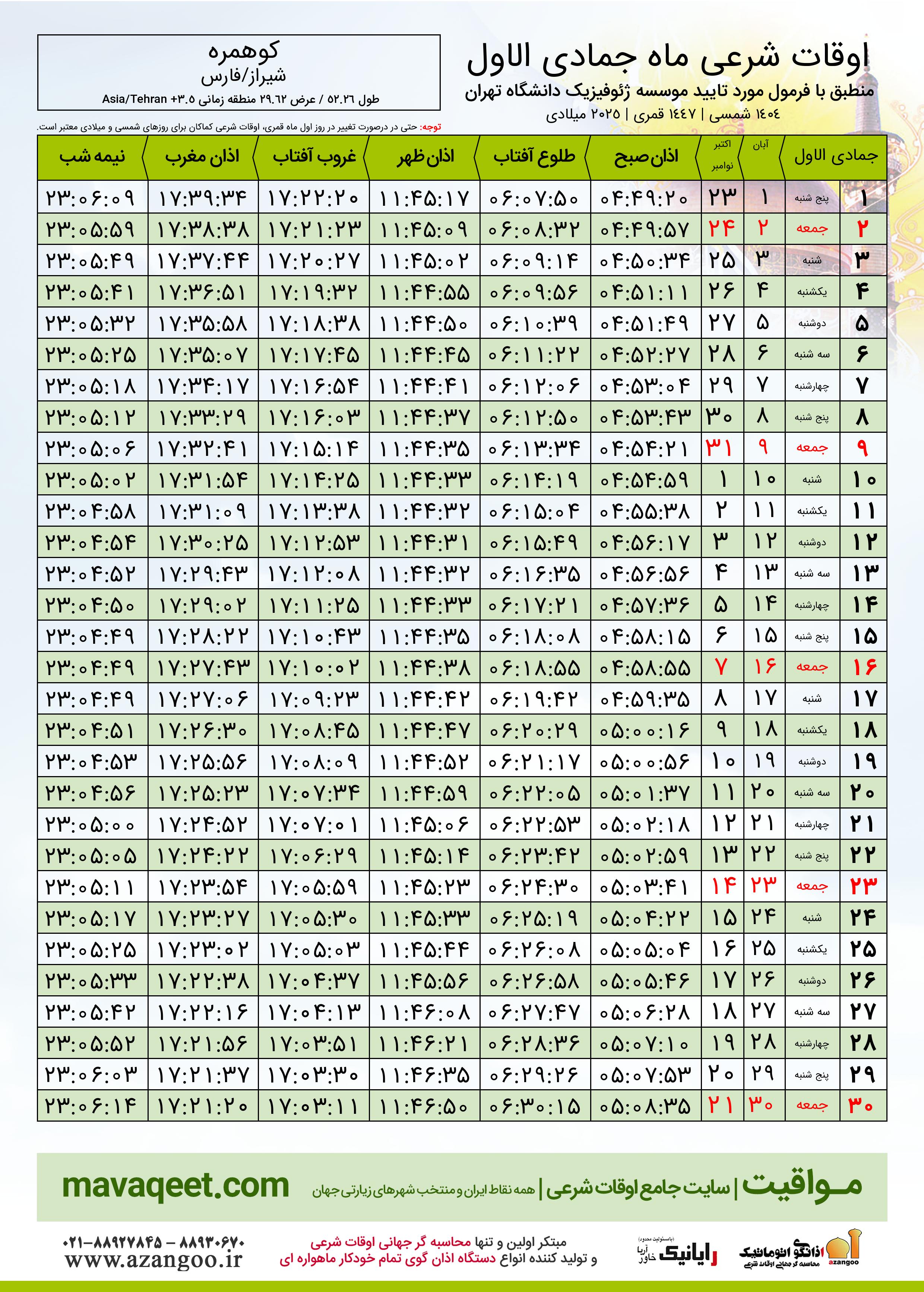 جدول اوقات شرعی جمادی الاول ١٤٤٧ قمری شهر کوهمره