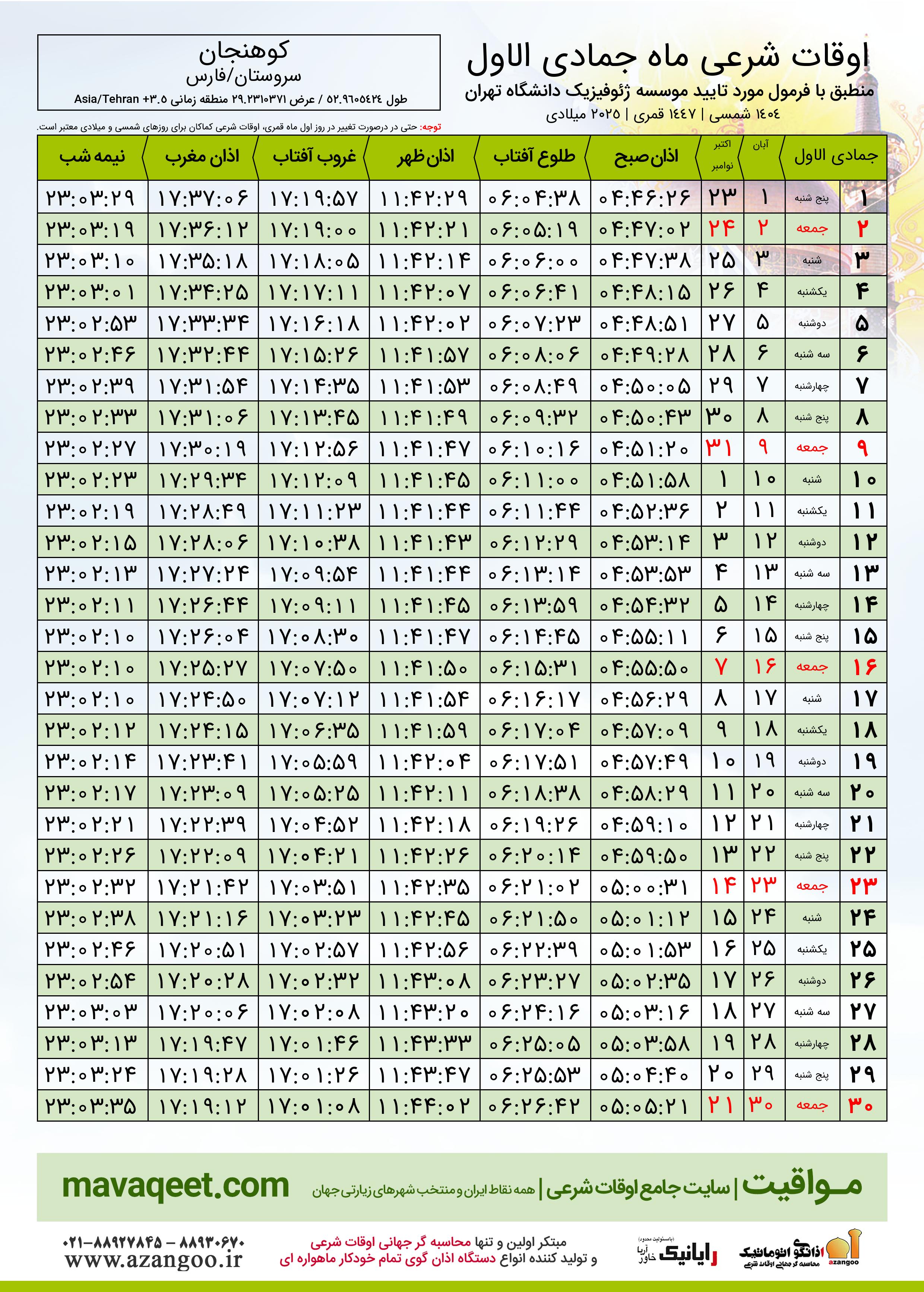 جدول اوقات شرعی جمادی الاول ١٤٤٧ قمری شهر کوهنجان