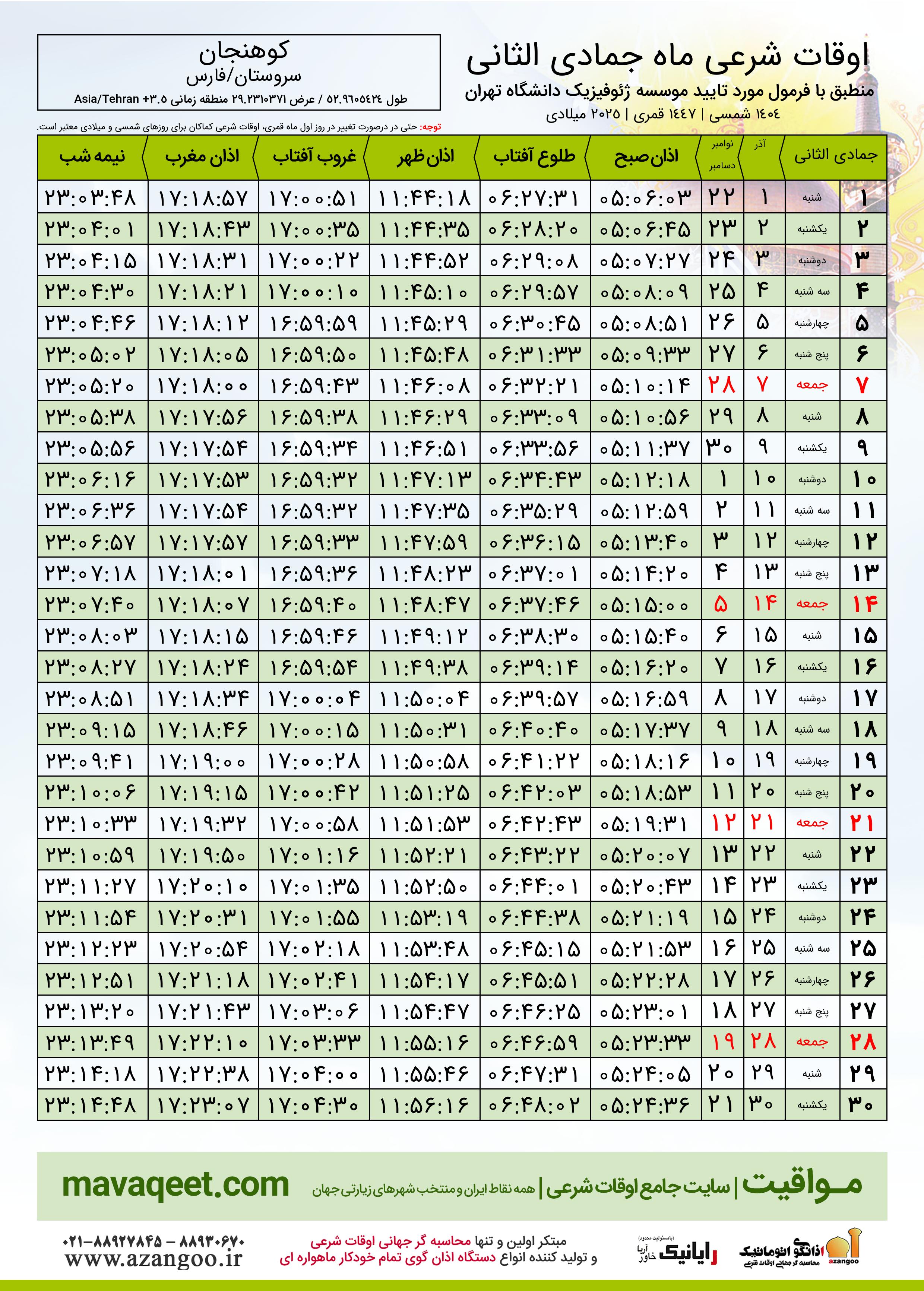 جدول اوقات شرعی جمادی الثانی ١٤٤٧ قمری شهر کوهنجان