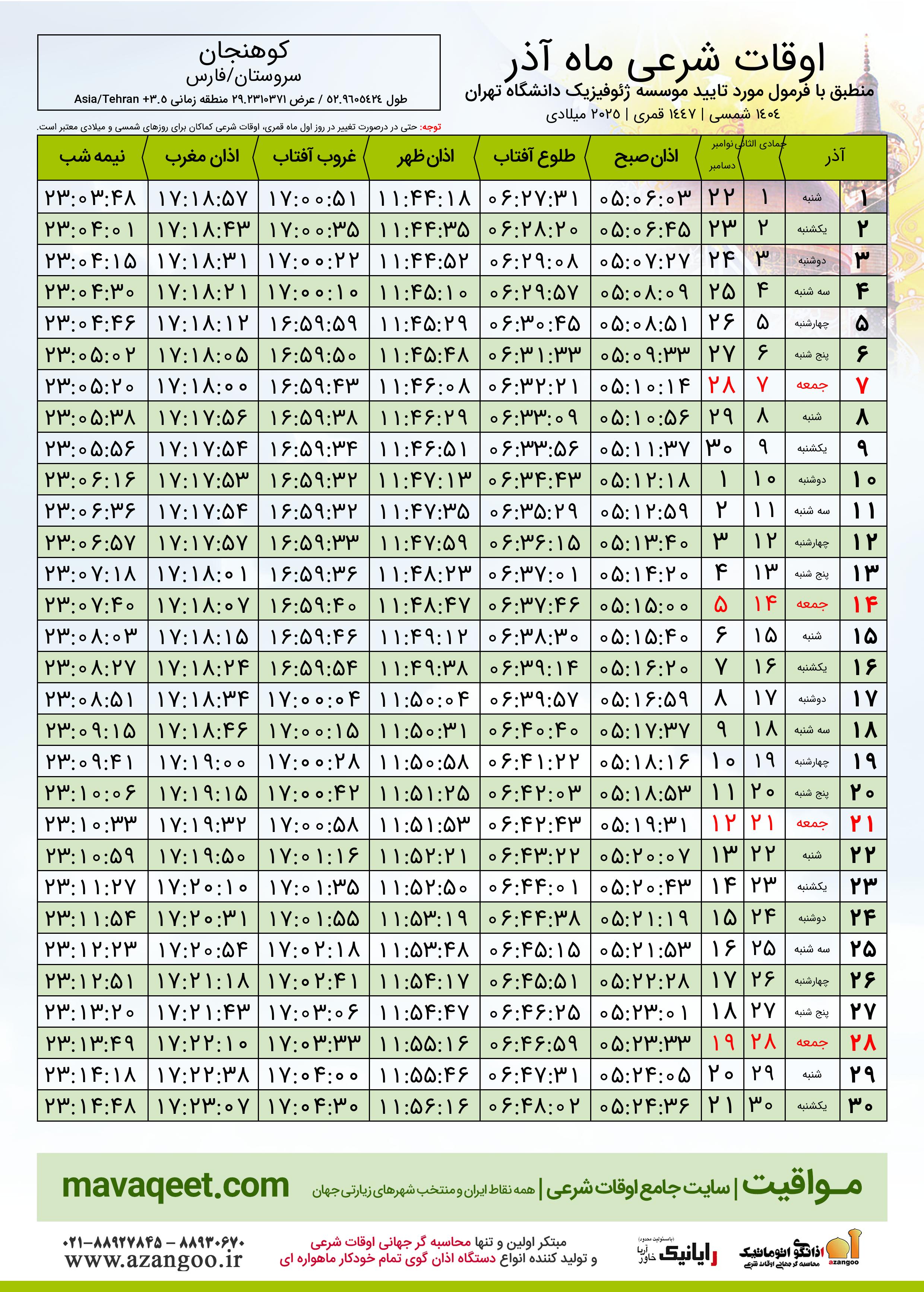 دانلود اوقات شرعی آذر ٠٤ - ١٤٠٤ شهر کوهنجان