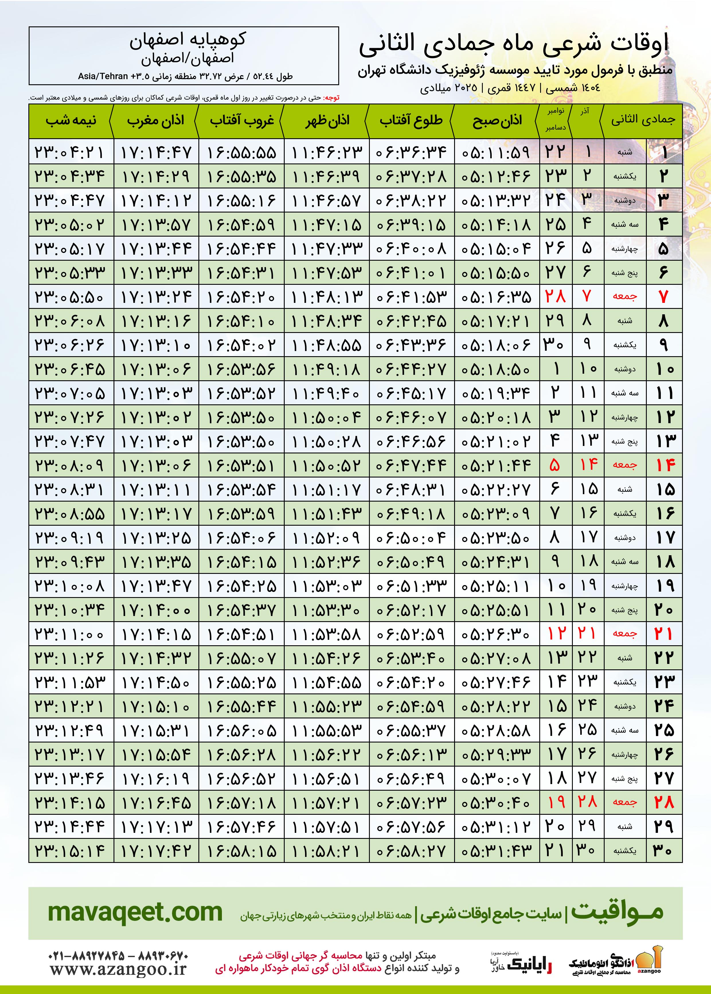 اوقات شرعی ماه جمادی الثانی ١٤٤٧ هـ.ق شهر کوهپایه اصفهان بر