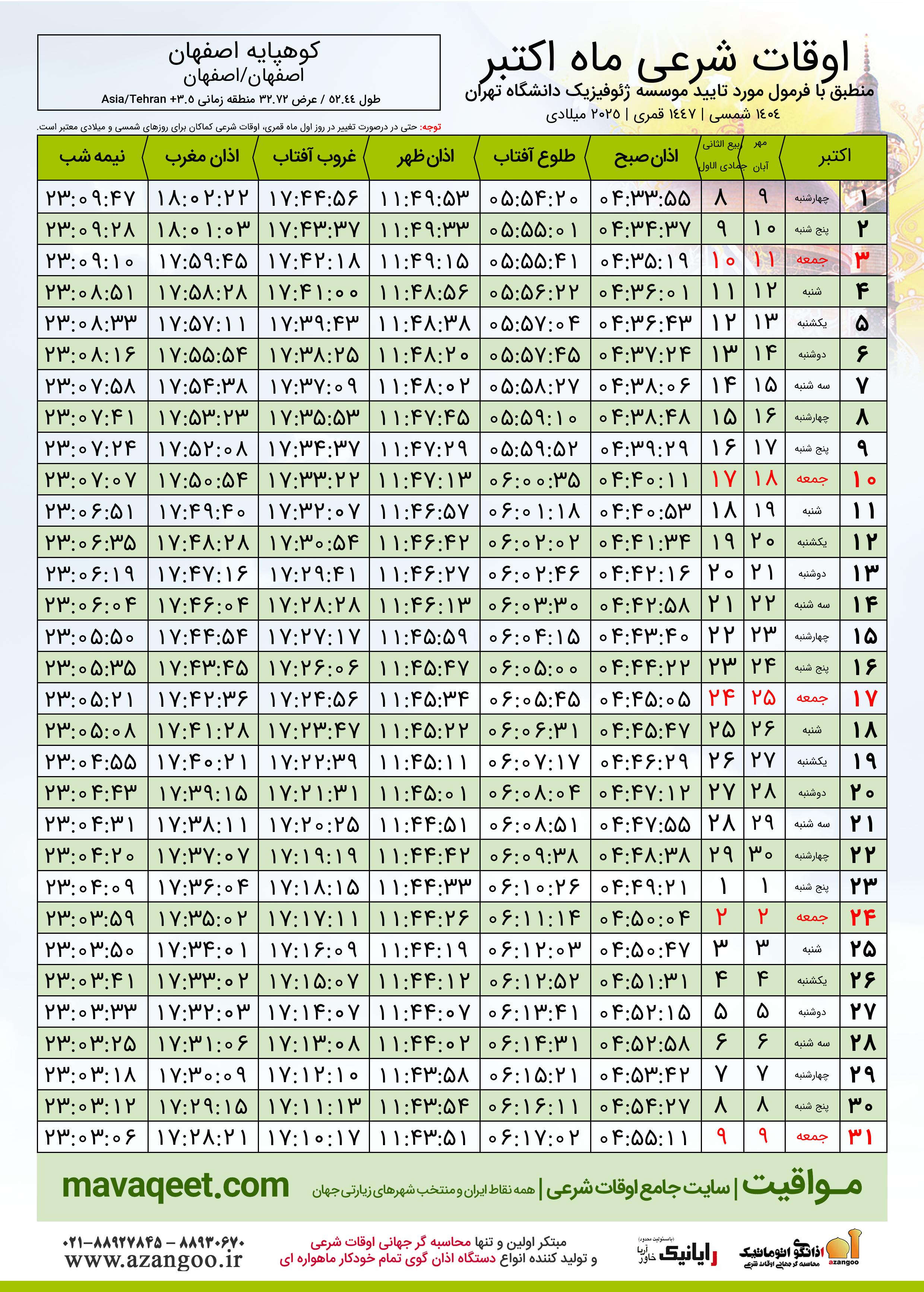 جدول اوقات شرعی اکتبر ٢٠٢٥ میلادی شهر کوهپایه اصفهان