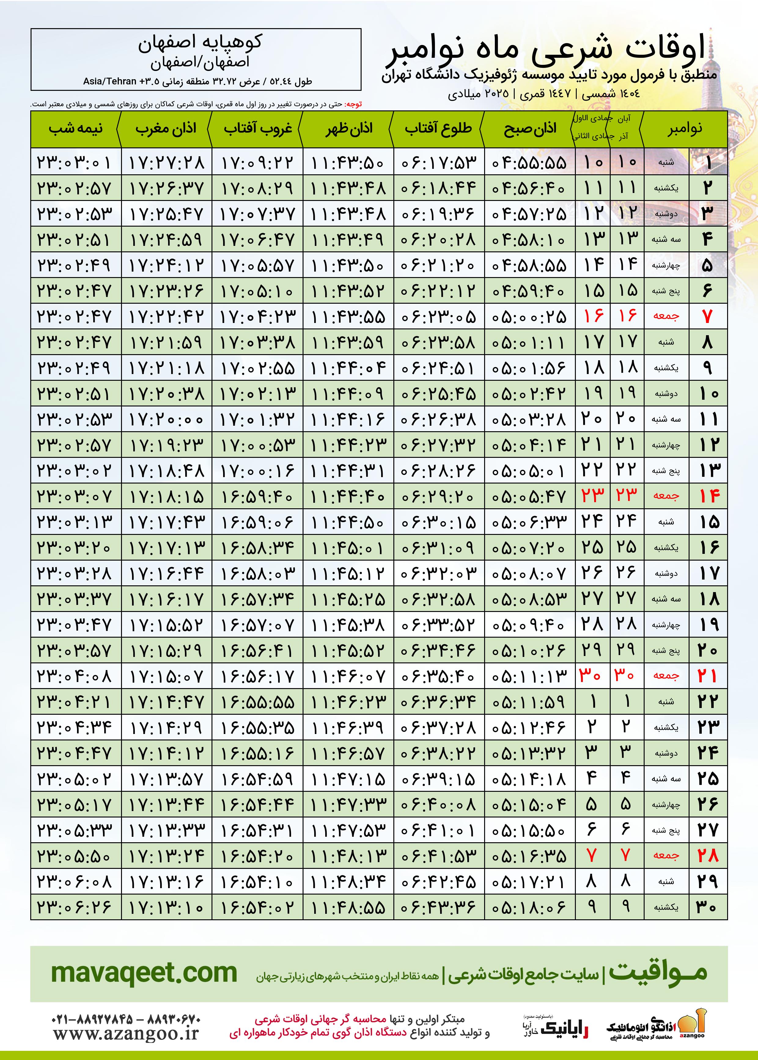 اوقات شرعی نوامبر ٢٠٢٥ میلادی شهر کوهپایه اصفهان