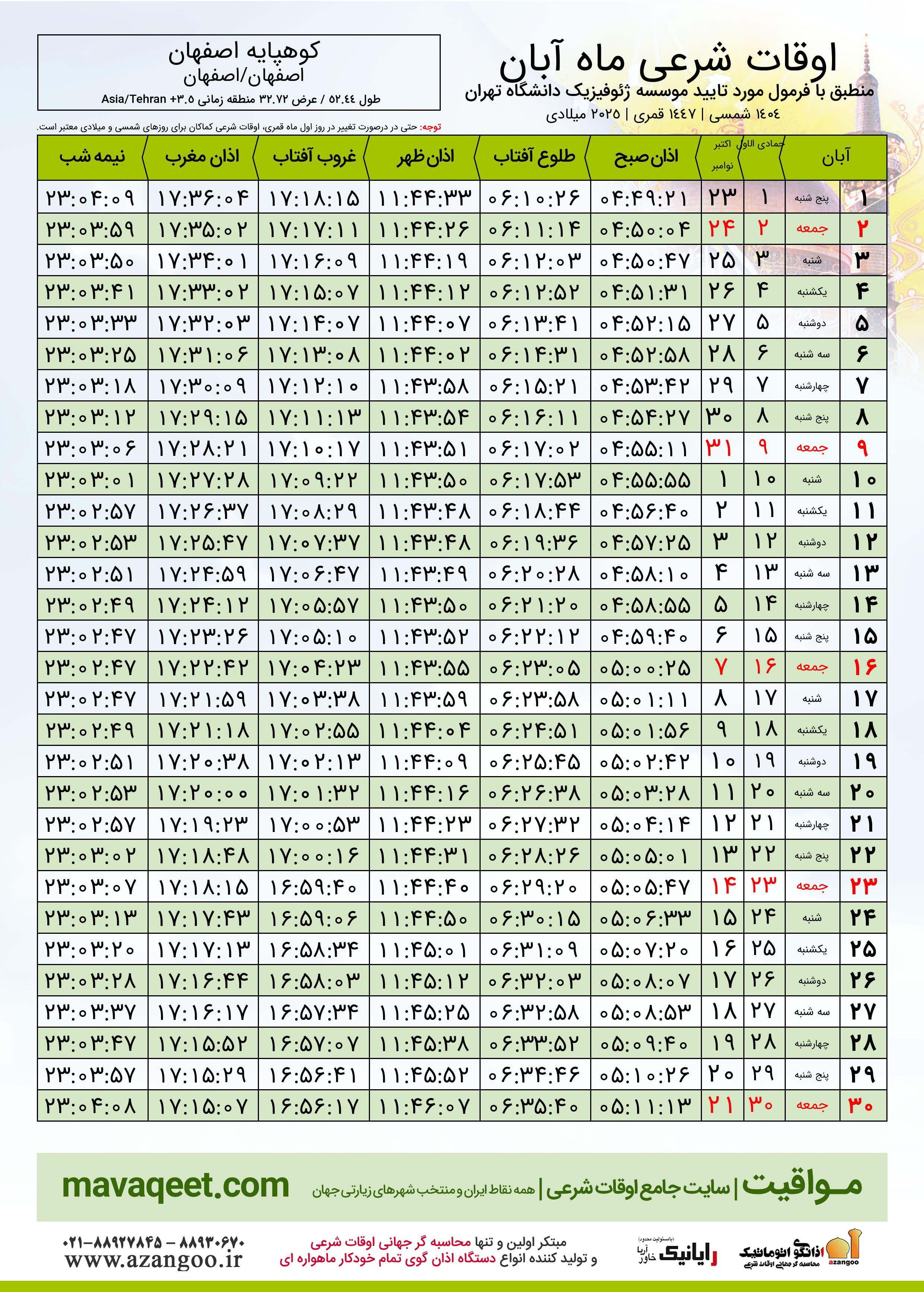 جدول اوقات شرعی آبان ١٤٠٤ شمسی شهر کوهپایه اصفهان