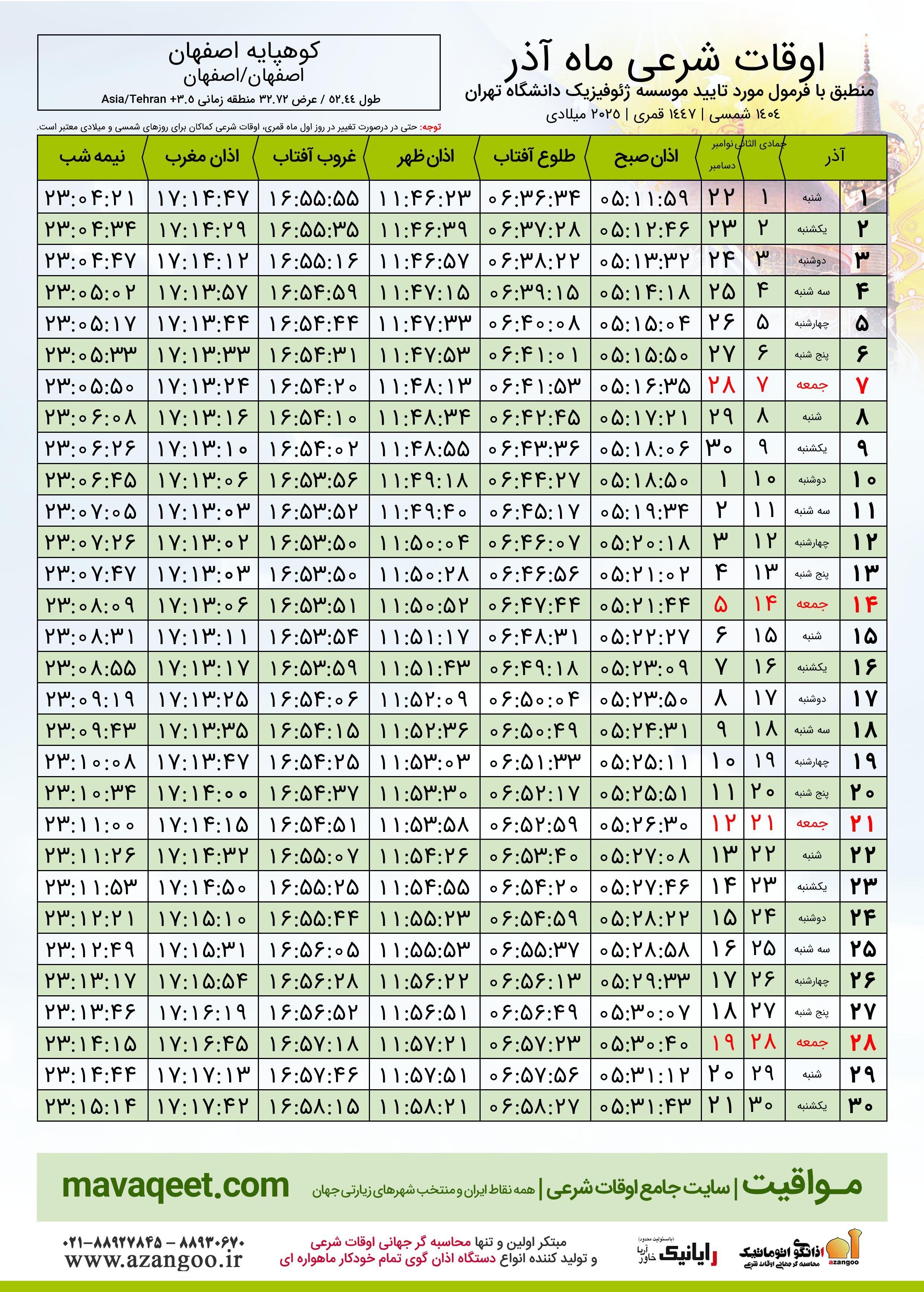 اوقات شرعی آذر ١٤٠٤ شمسی شهر کوهپایه اصفهان