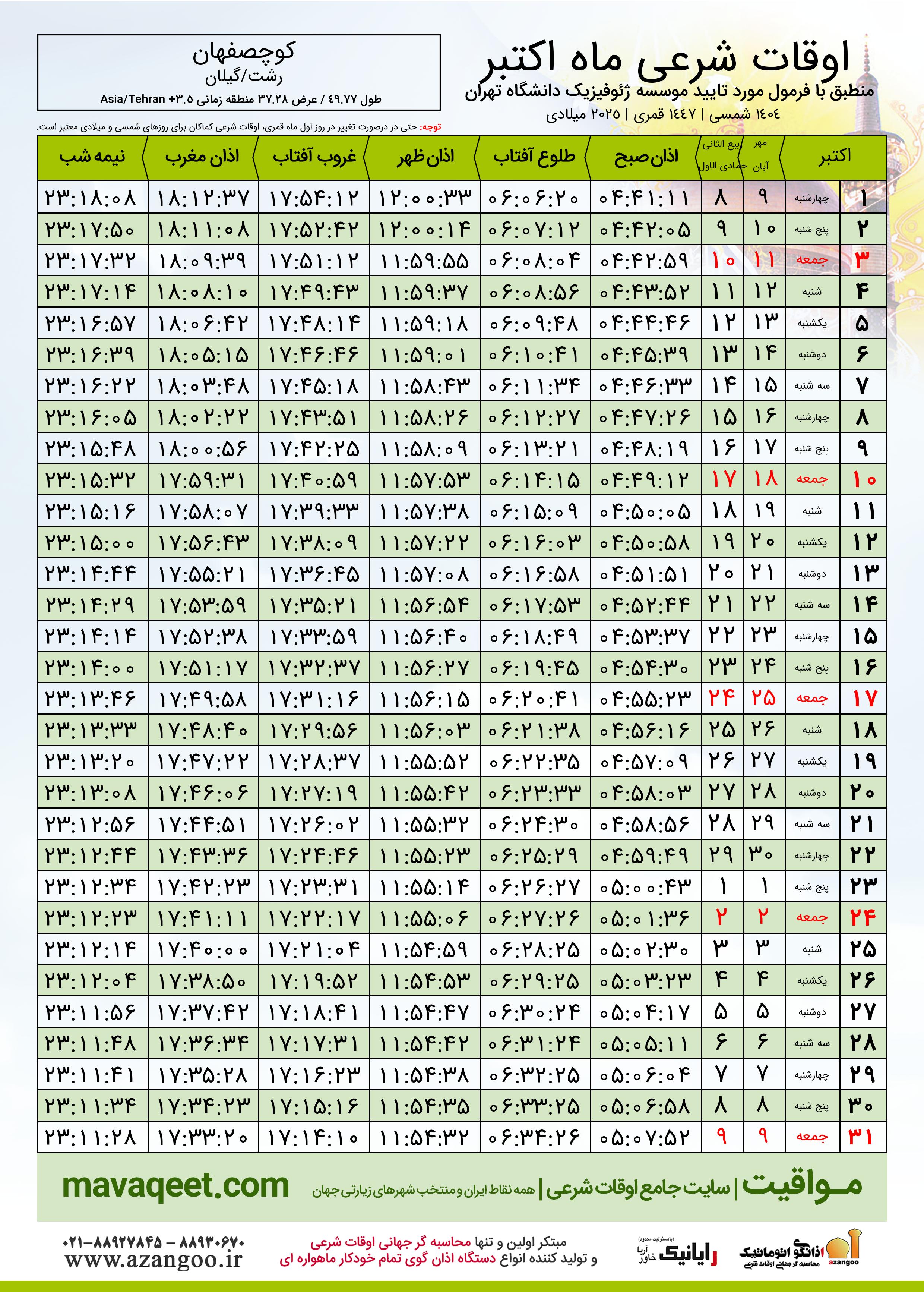 جهت نمایش تصویر جدول اوقات شرعی جدول اوقات شرعی اکتبر ٢٠٢٥ میلادی شهر کوچصفهان شهر کوچصفهان در اندازه