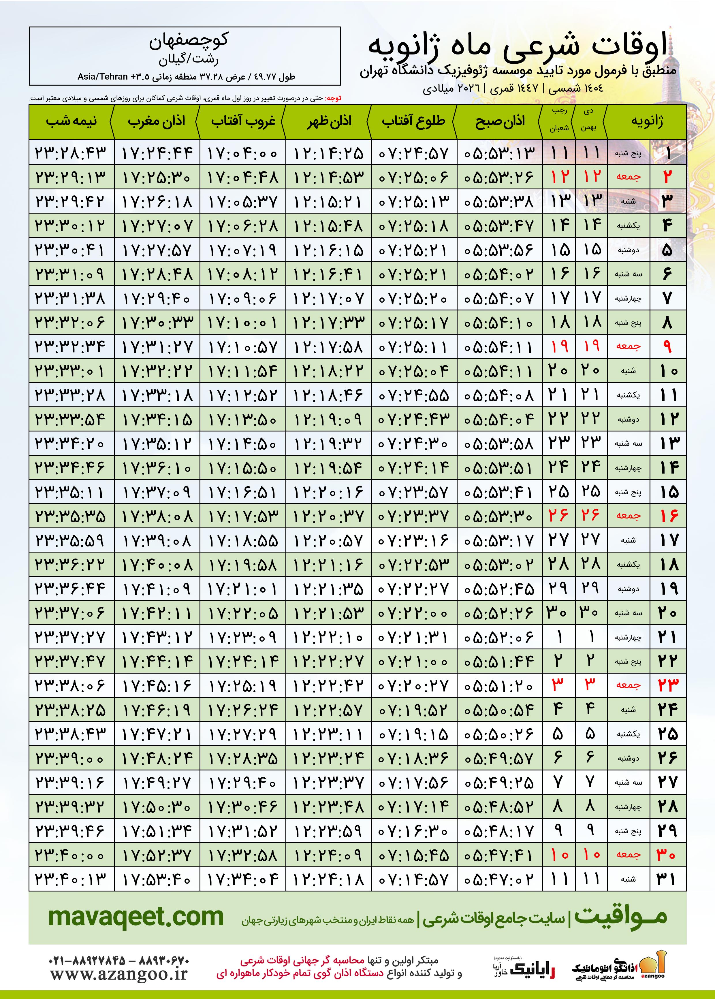 اوقات شرعی ماه رمضان شهر کوچصفهان ١٤٠٤ - ٠٤ شمسی | ٢٠٢٦ میلادی