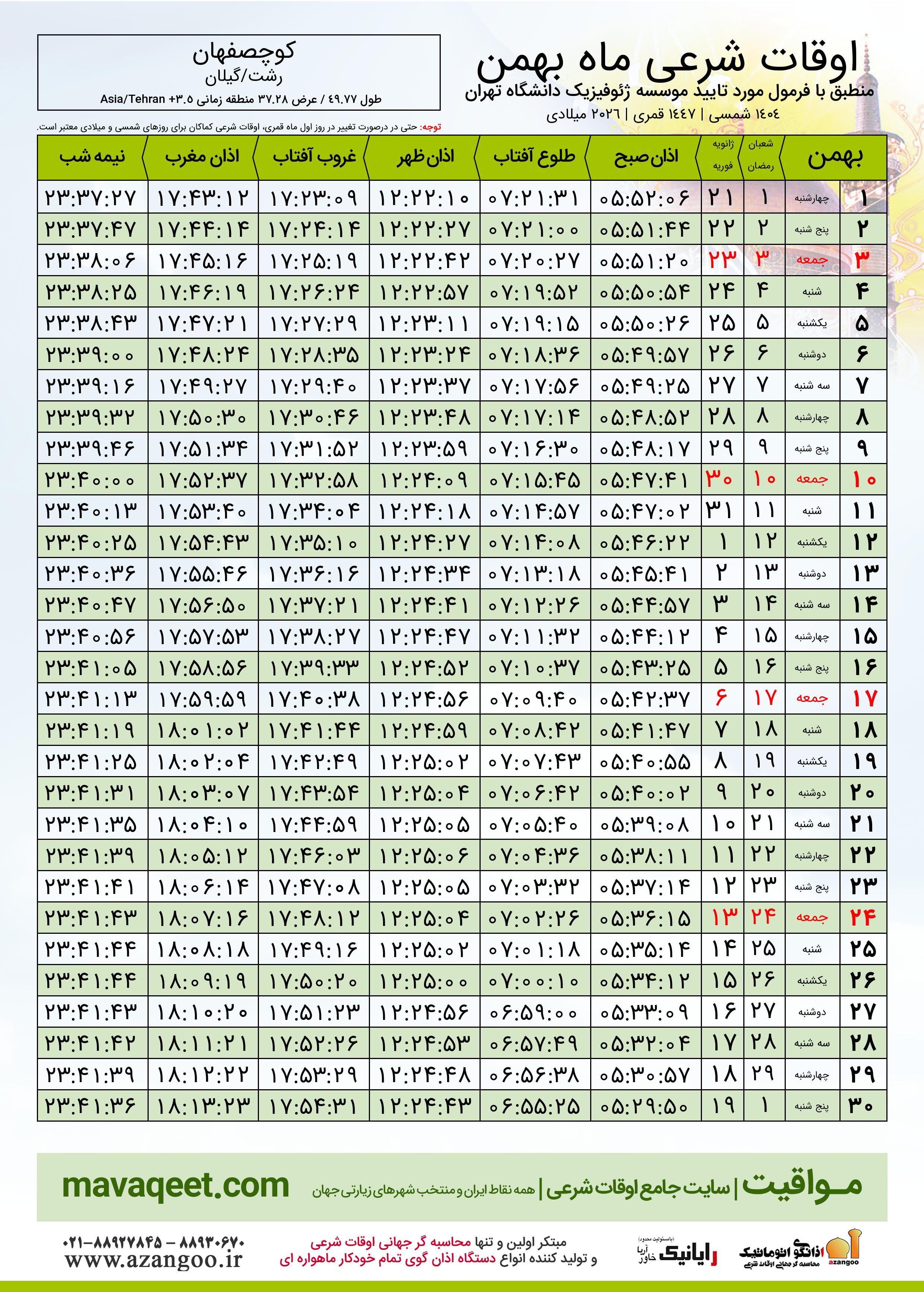 دانلود اوقات شرعی بهمن ٠٤ - ١٤٠٤ شهر کوچصفهان