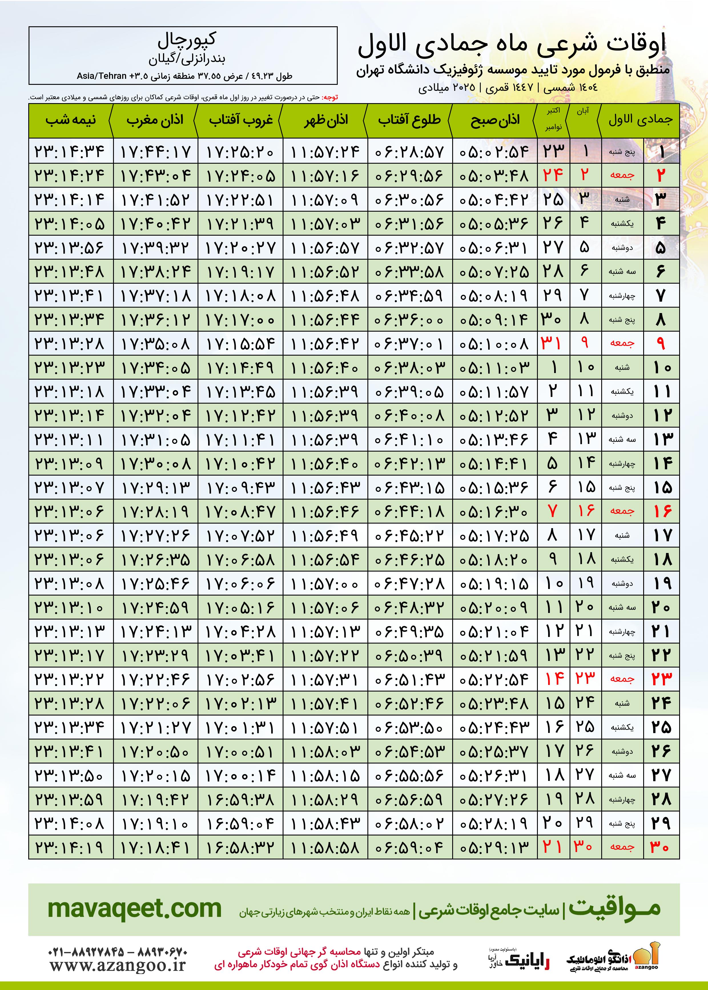 اوقات شرعی ماه جمادی الاول ١٤٤٧ هـ.ق شهر کپورچال بر