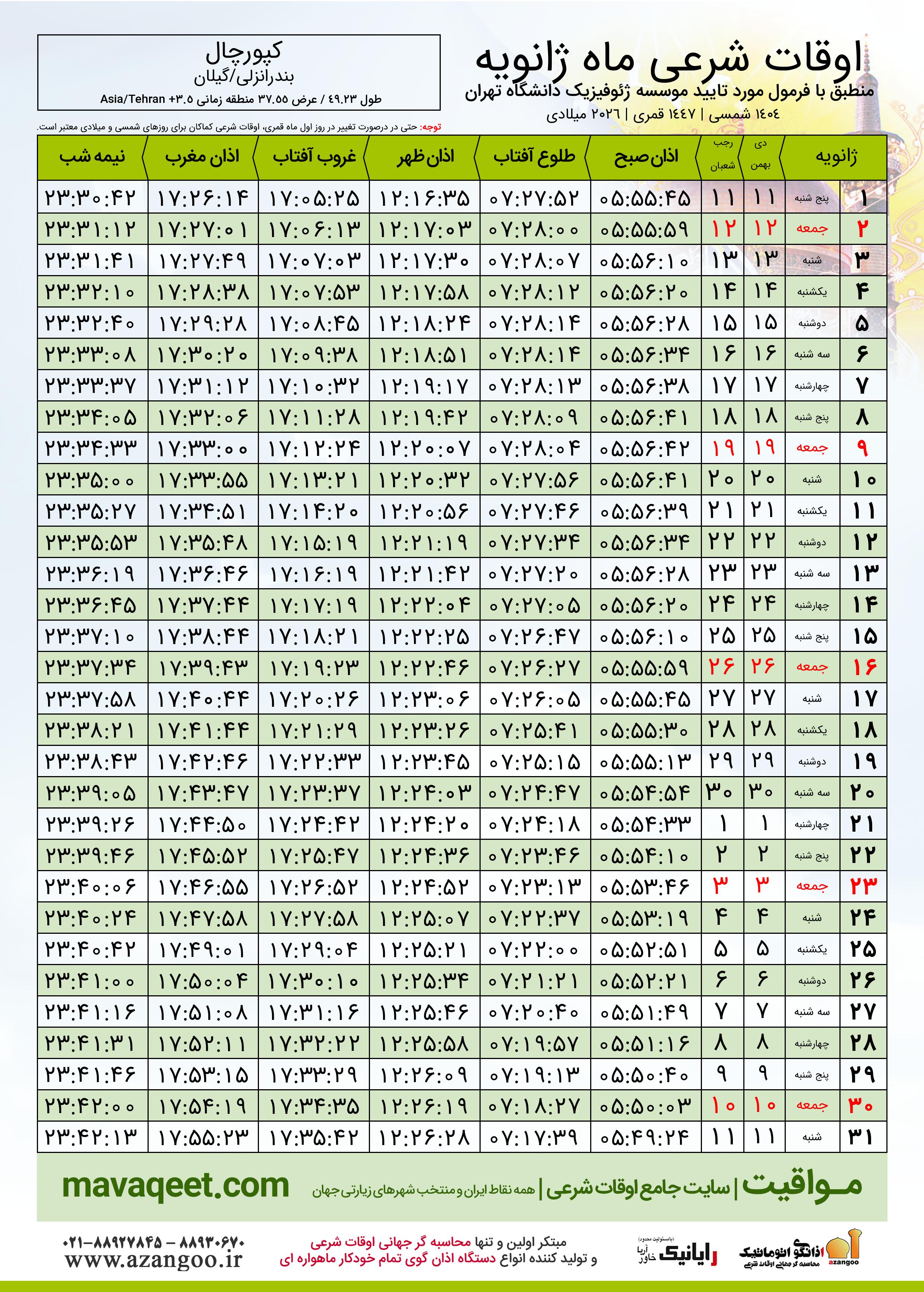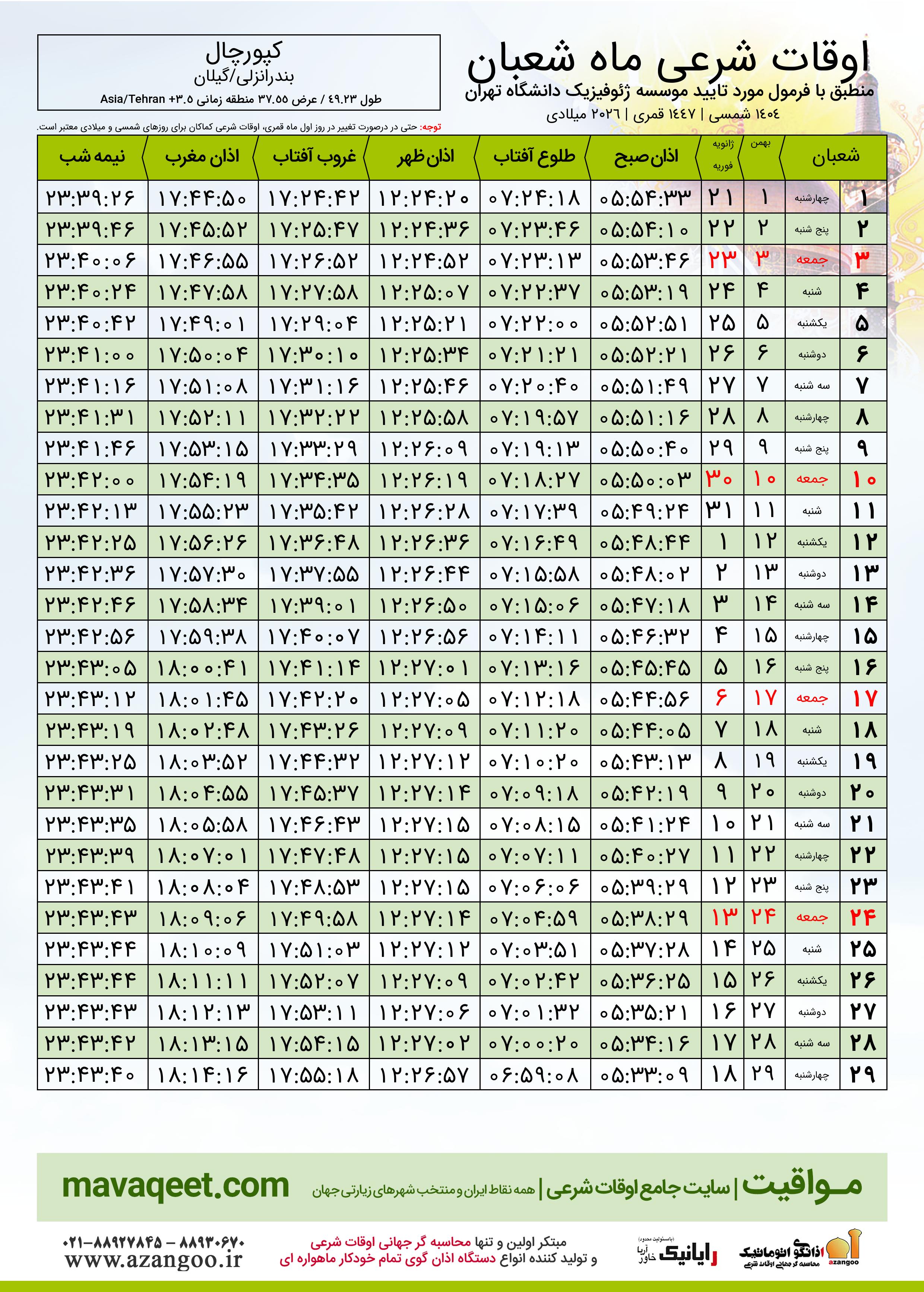 اوقات شرعی ماه شعبان ١٤٤٧ هـ.ق شهر کپورچال بر