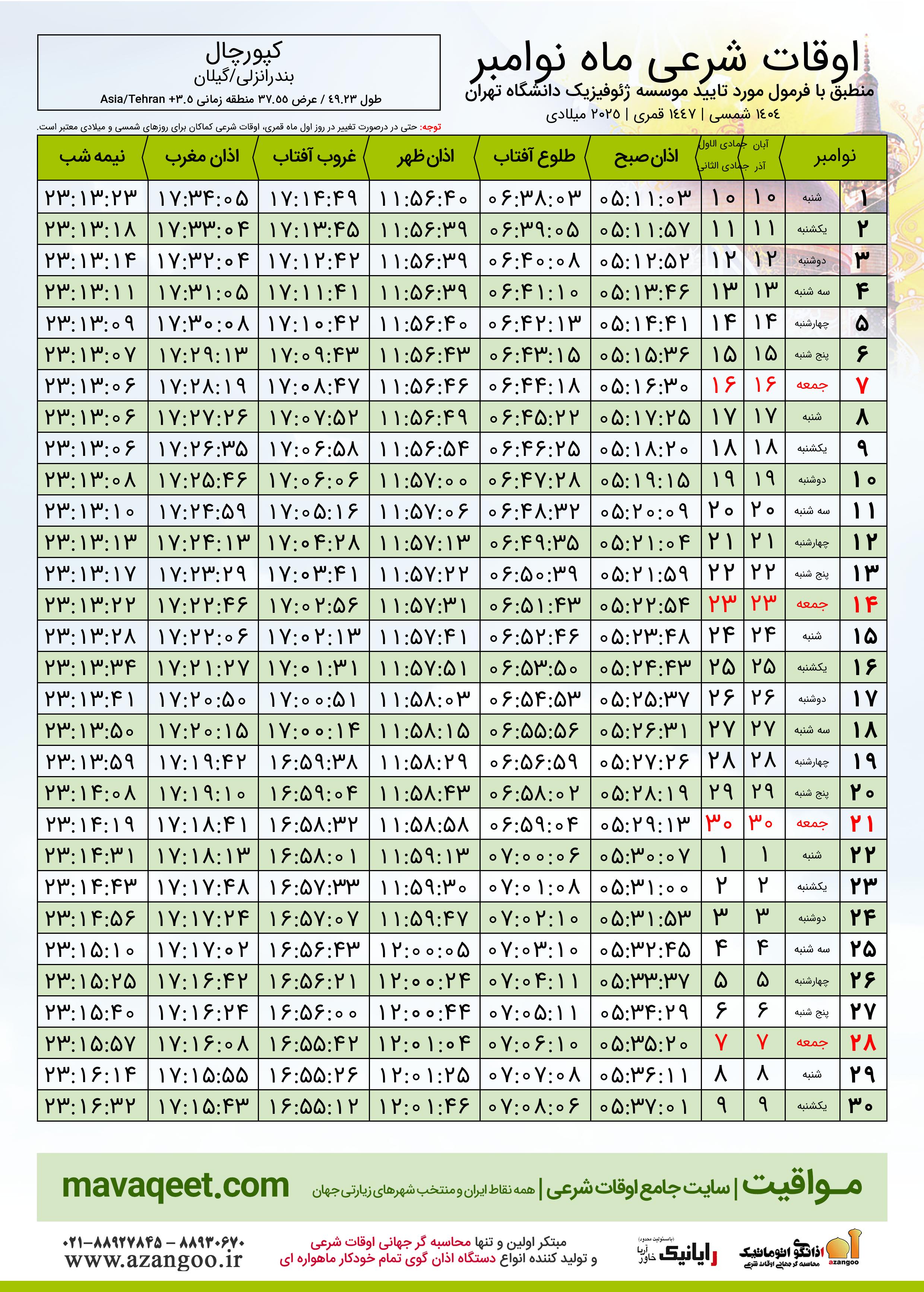جدول اوقات شرعی آبان ١٤٠٤ شمسی شهر کپورچال