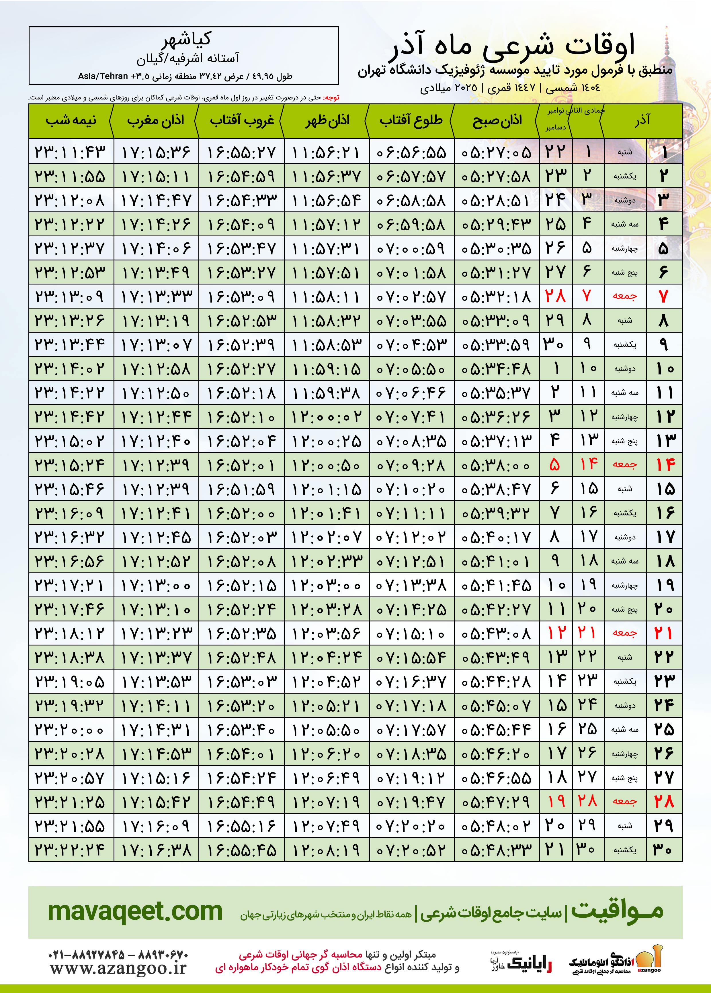 جدول اوقات شرعی آذر ١٤٠٤ شمسی شهر کیاشهر