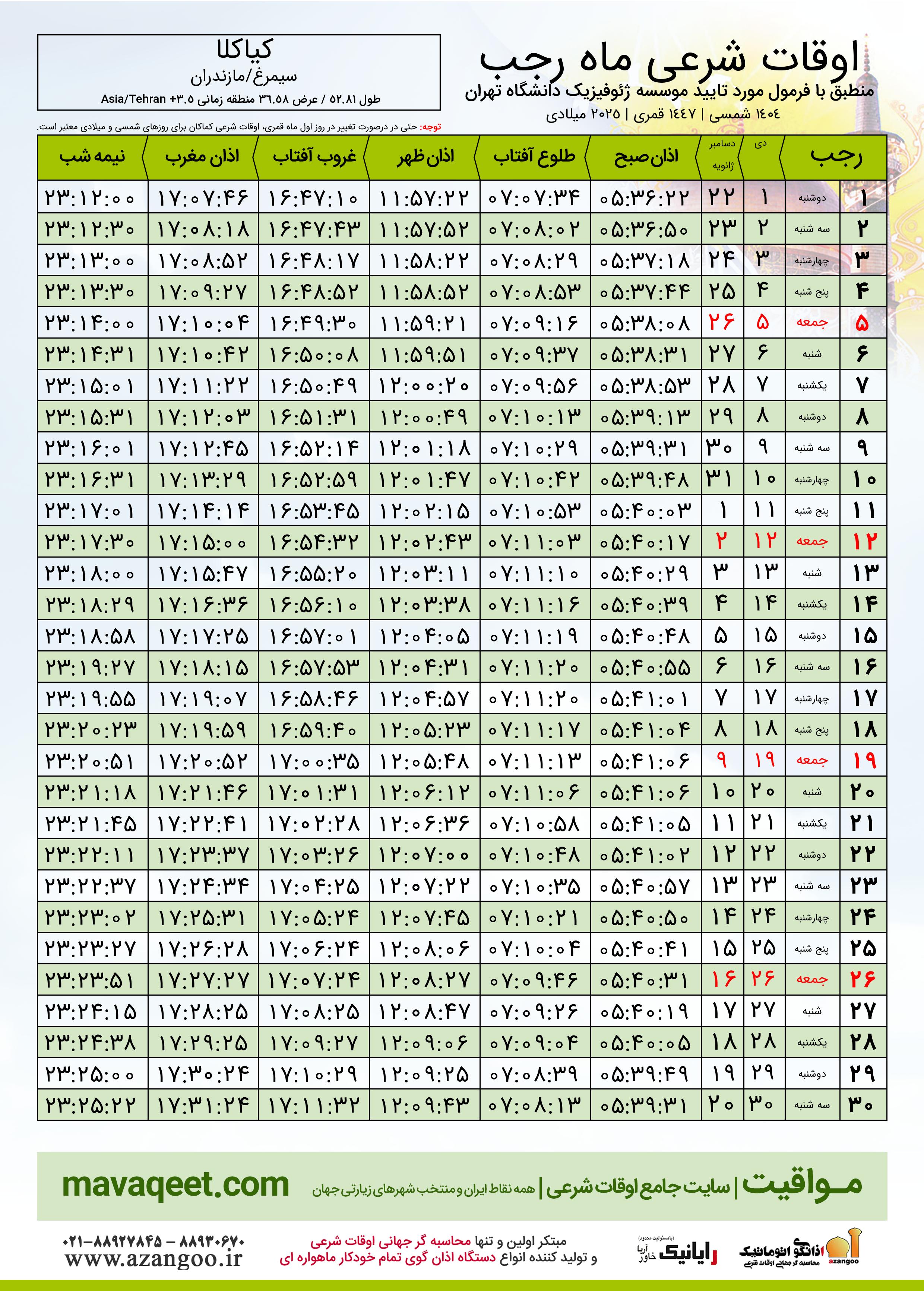 جدول اوقات شرعی رجب ١٤٤٧ قمری شهر کیاکلا