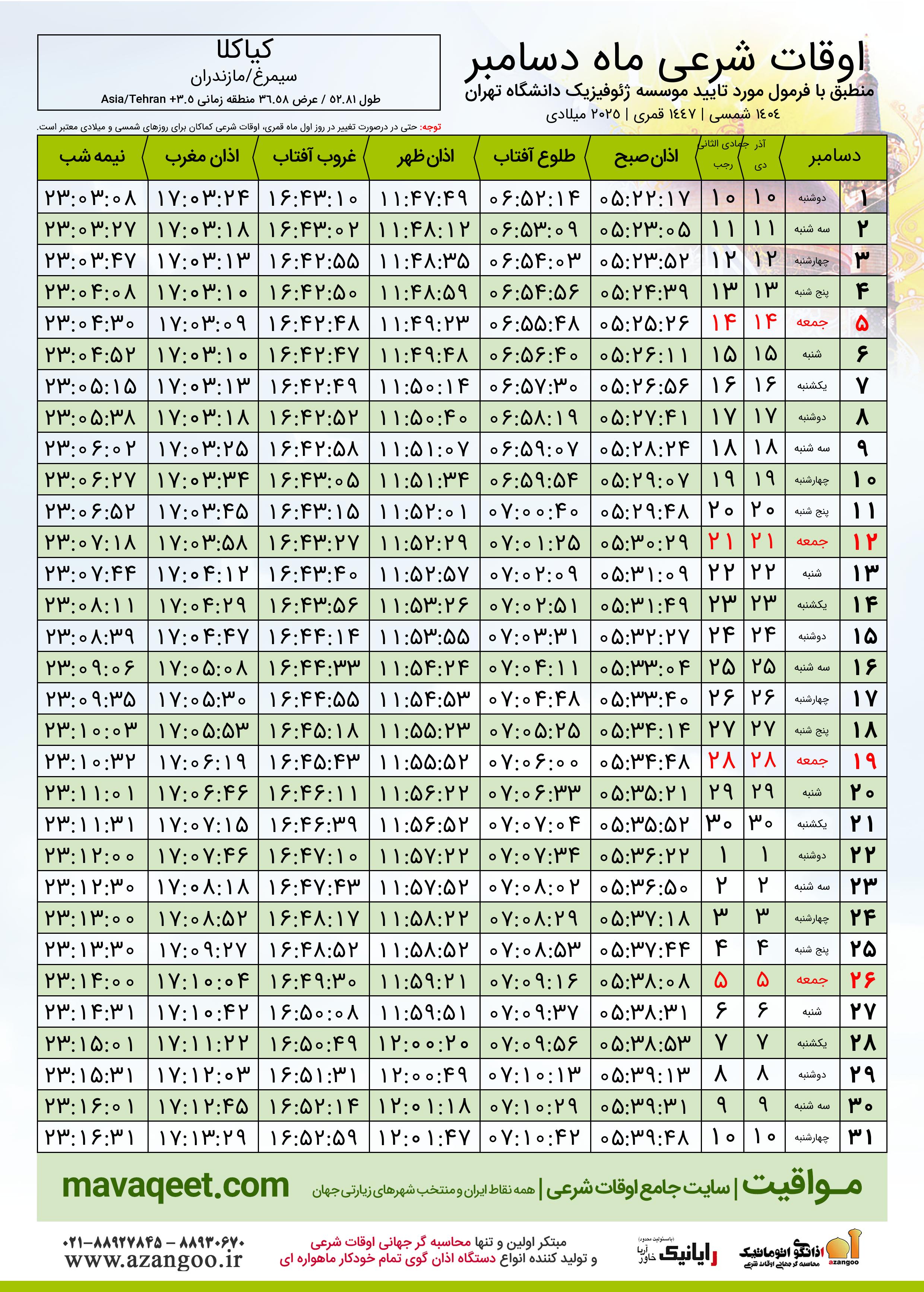 جدول اوقات شرعی دسامبر ٢٠٢٥ میلادی شهر کیاکلا