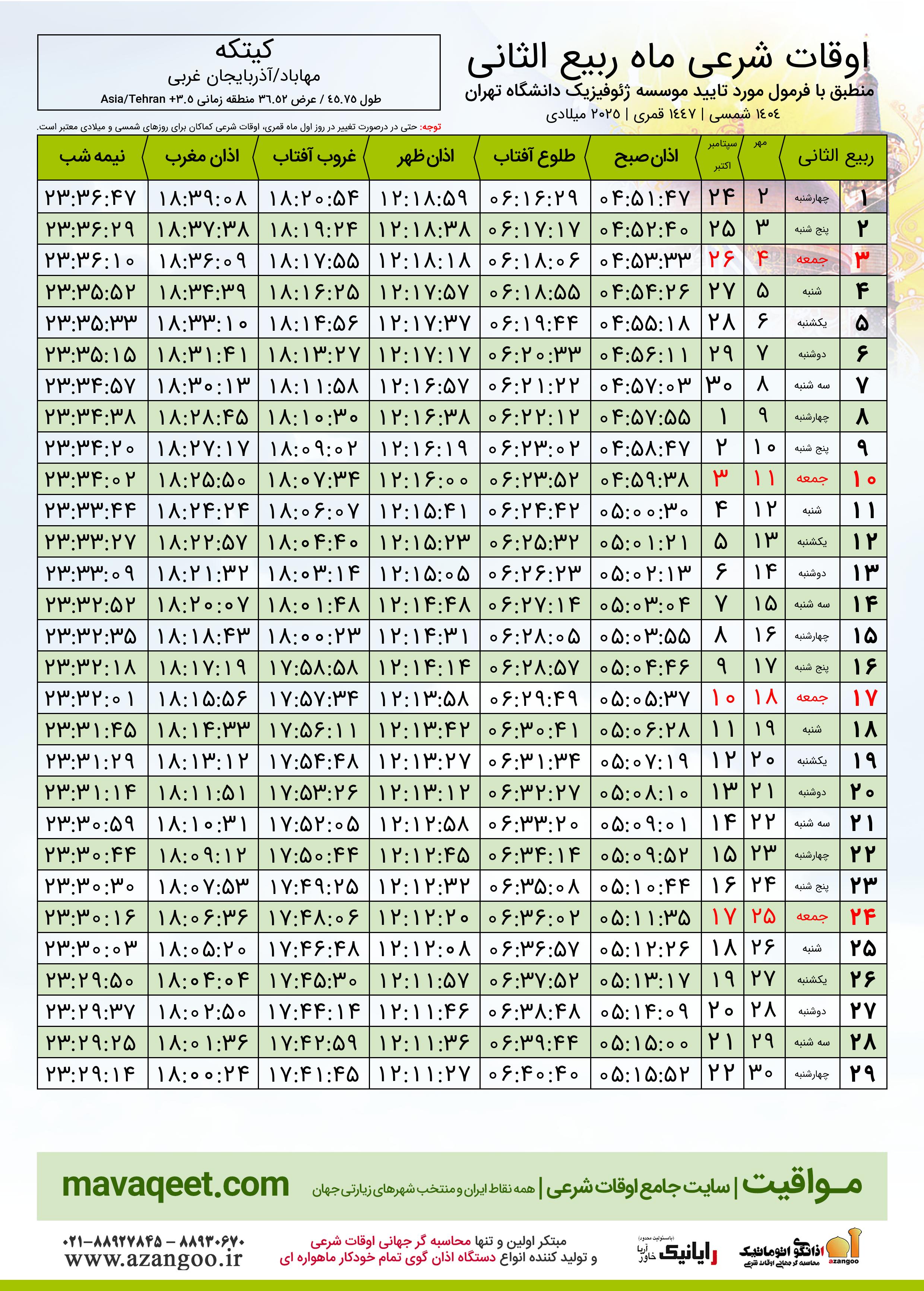 دانلود اوقات شرعی ماه ربیع الثانی ١٤٤٧ هـ.ق