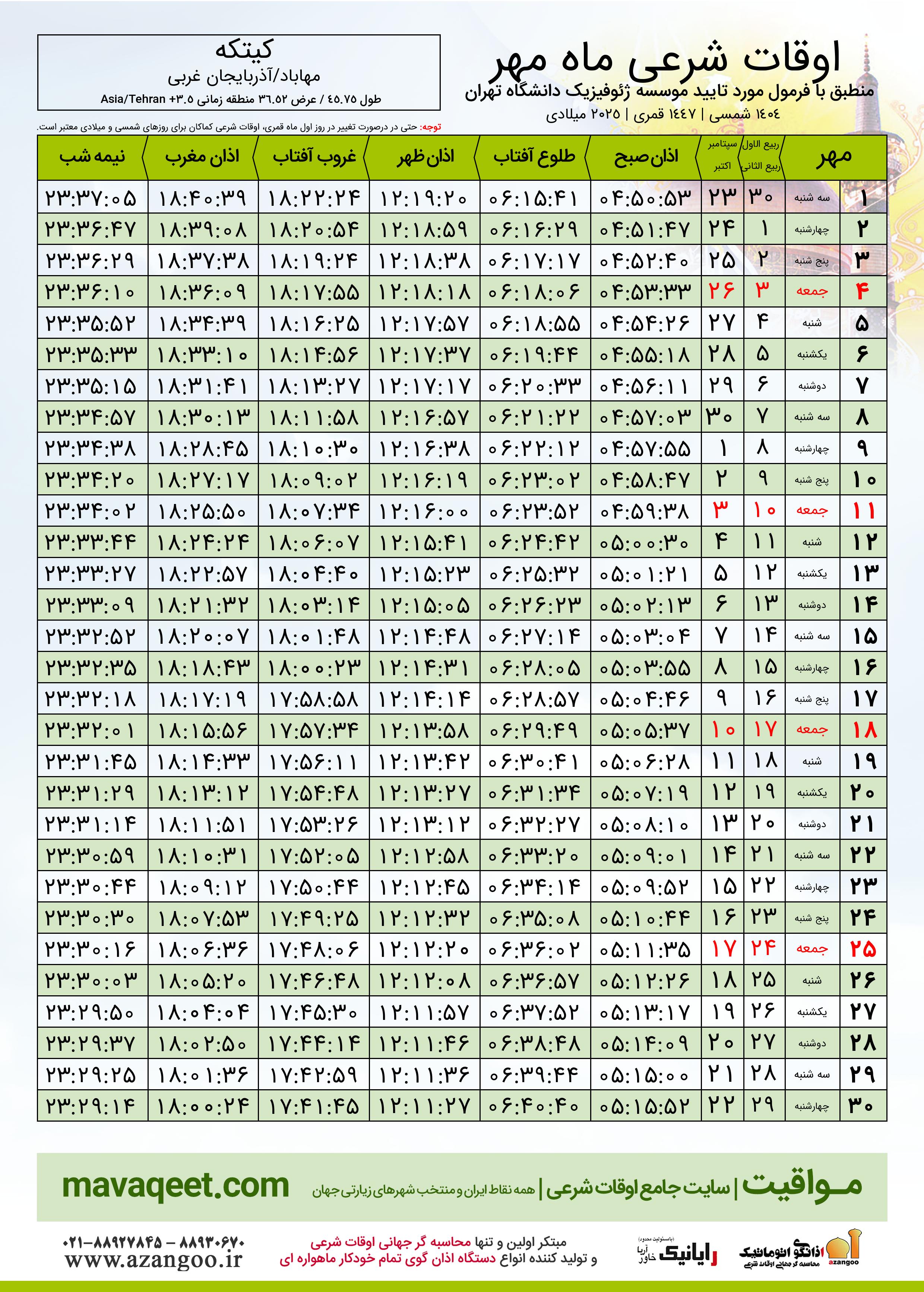 اوقات شرعی مهر ١٤٠٤ شمسی شهر کیتکه