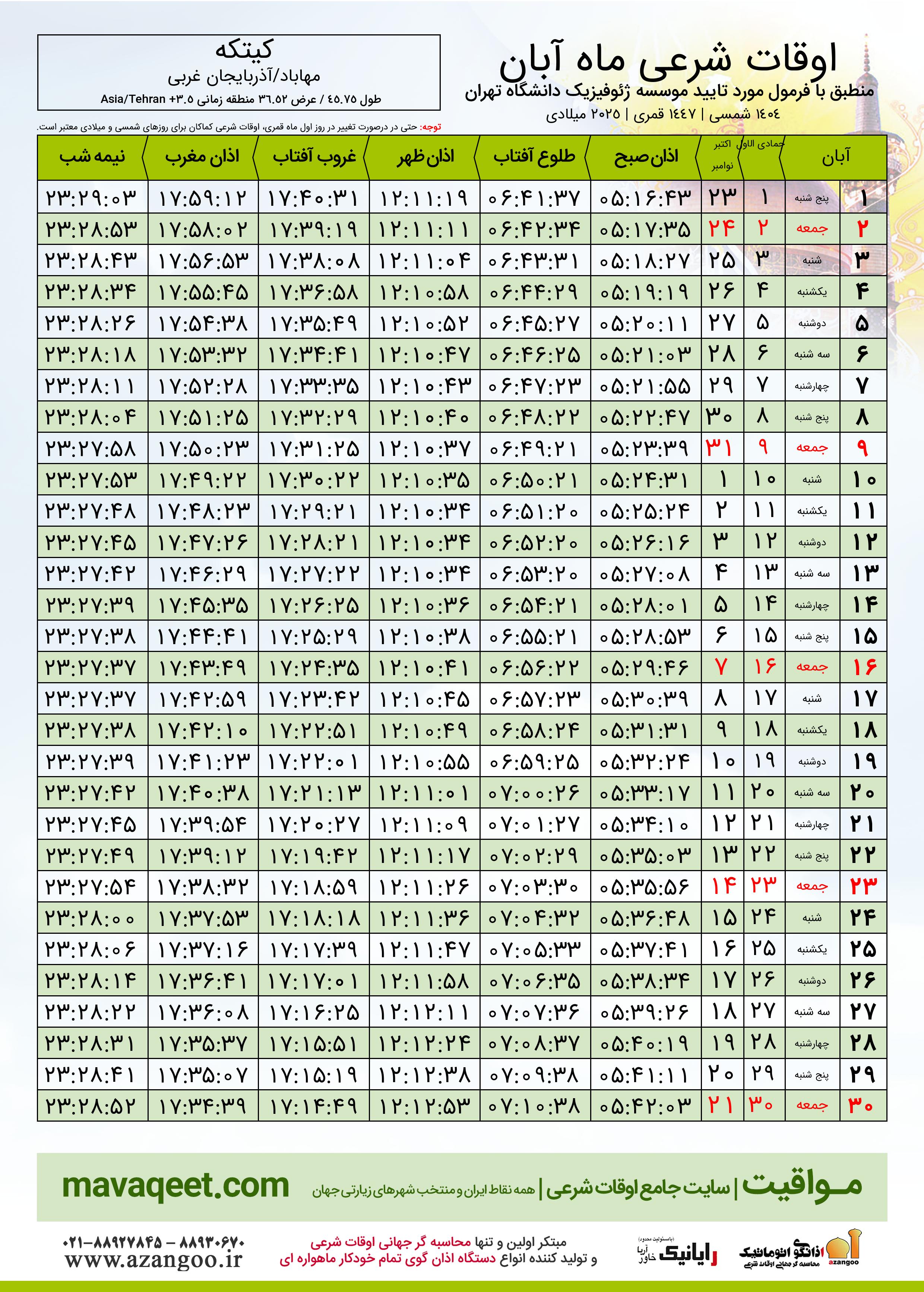 اوقات شرعی آبان ١٤٠٤ شمسی شهر کیتکه