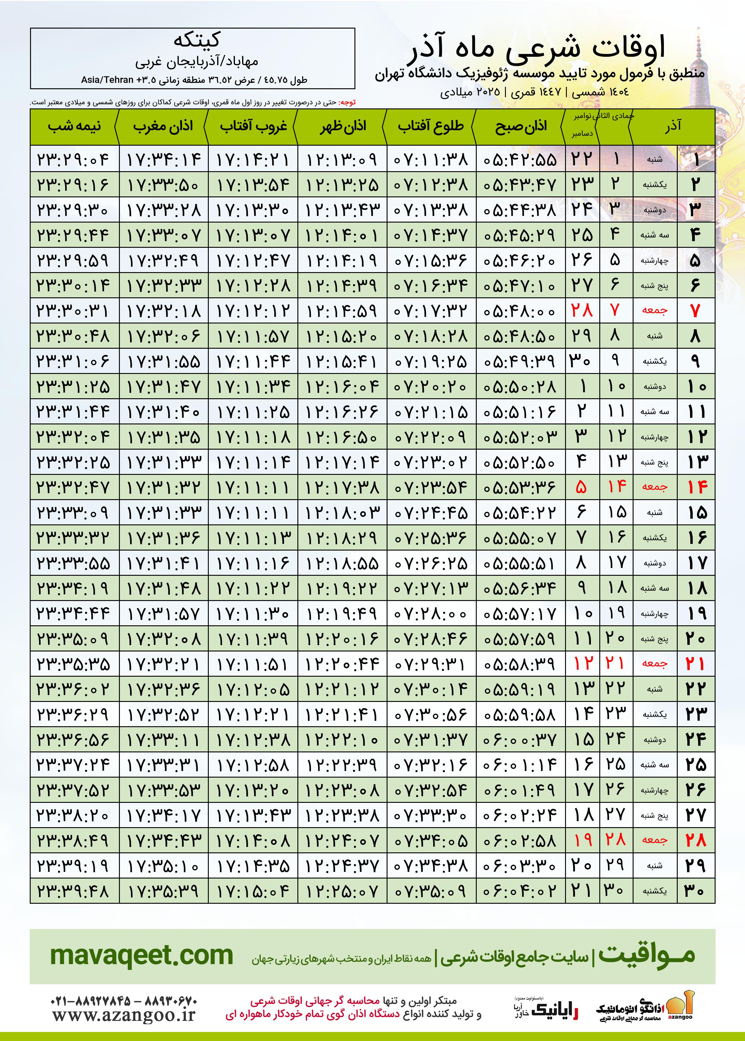 اوقات شرعی آذر ١٤٠٤ شمسی شهر کیتکه
