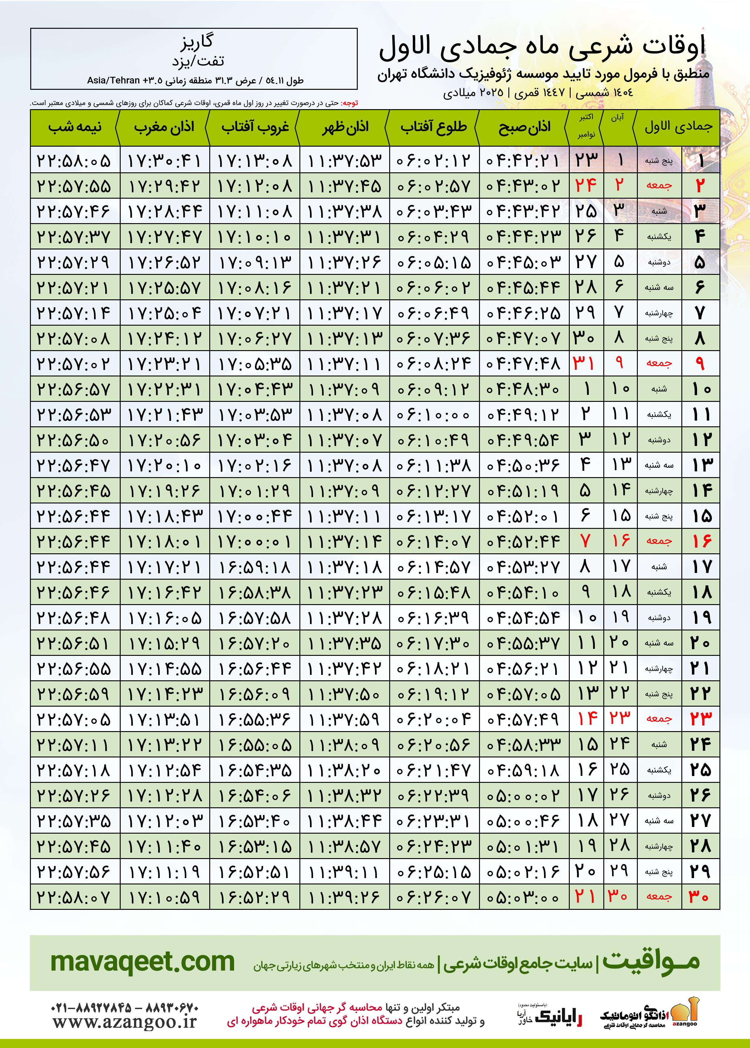 جدول اوقات شرعی جمادی الاول ١٤٤٧ قمری شهر گاریز