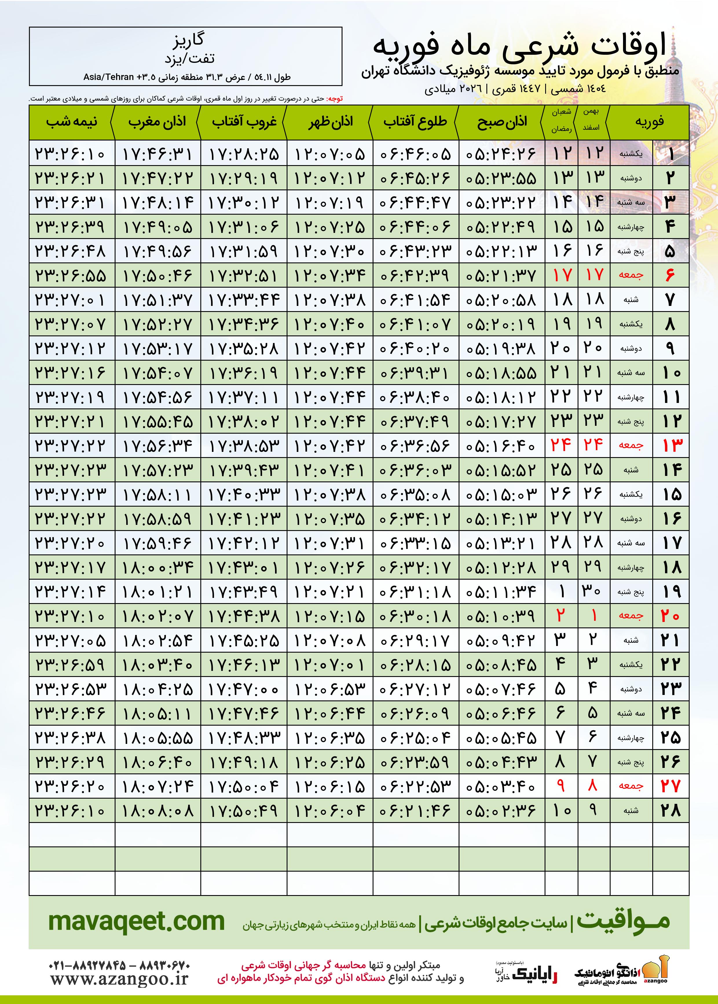 دانلود اوقات شرعی ماه رمضان ٠٤ - ١٤٠٤ شمسی | ٢٠٢٦ میلادی | ١٤٤٧ قمری شهر گاریز