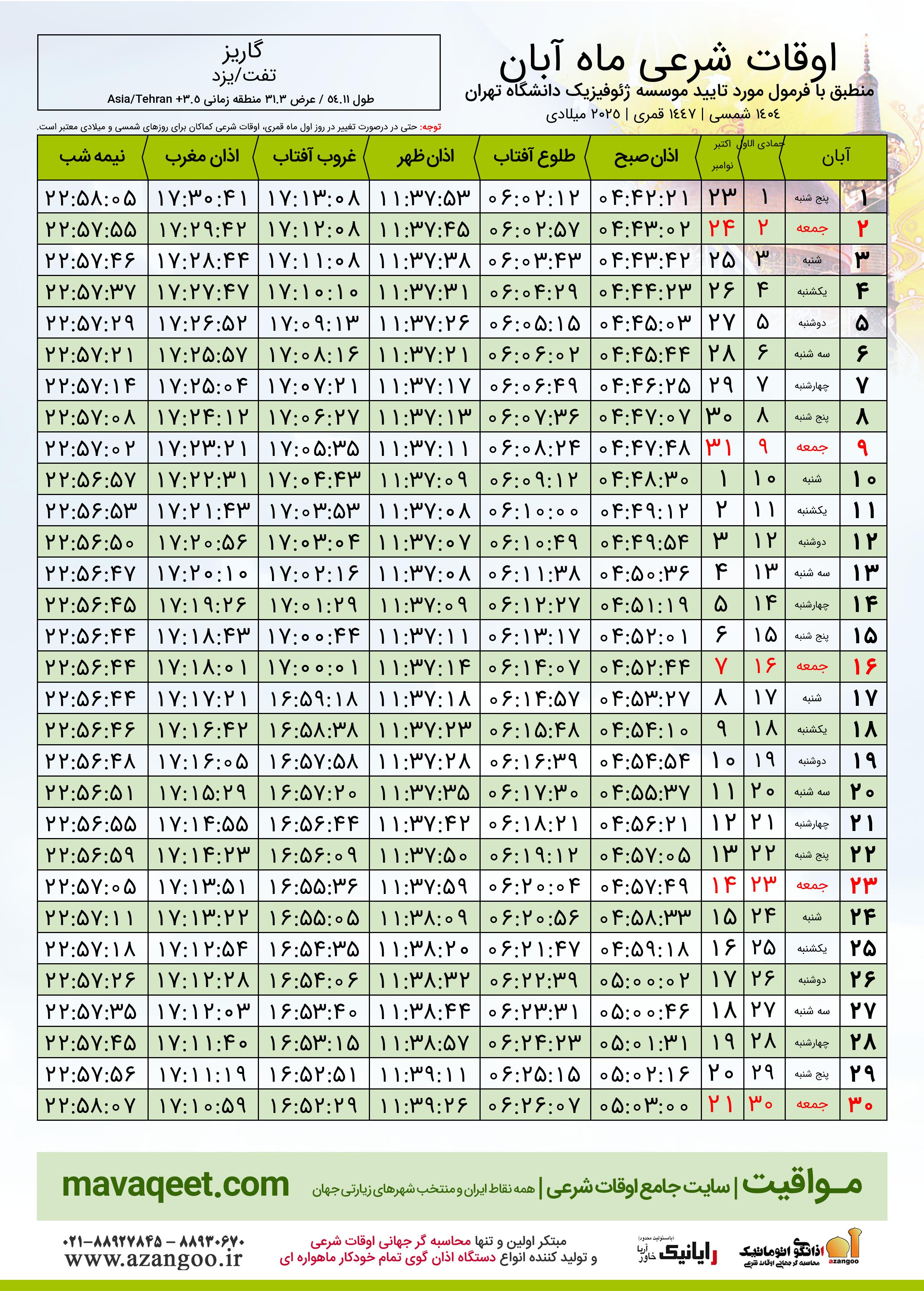 جدول اوقات شرعی آبان ١٤٠٤ شمسی شهر گاریز
