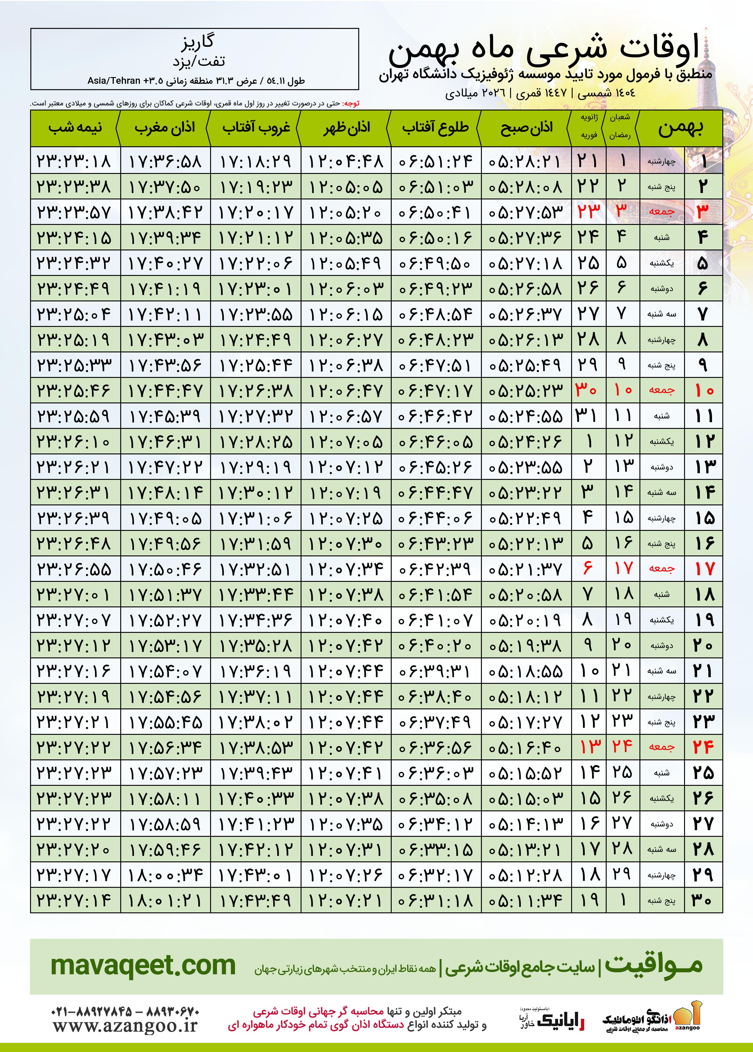 | ٢٩ بهمن ١٤٠٤ | ٠٥:١٢:٢٨ | ٠٦:٣٢:١٧ | ١٢:٠٧:٢٦ | ١٧:٤٣:٠١ | ١٨:٠٠:٣٤ | ٢٣:٢٧:١٧ |