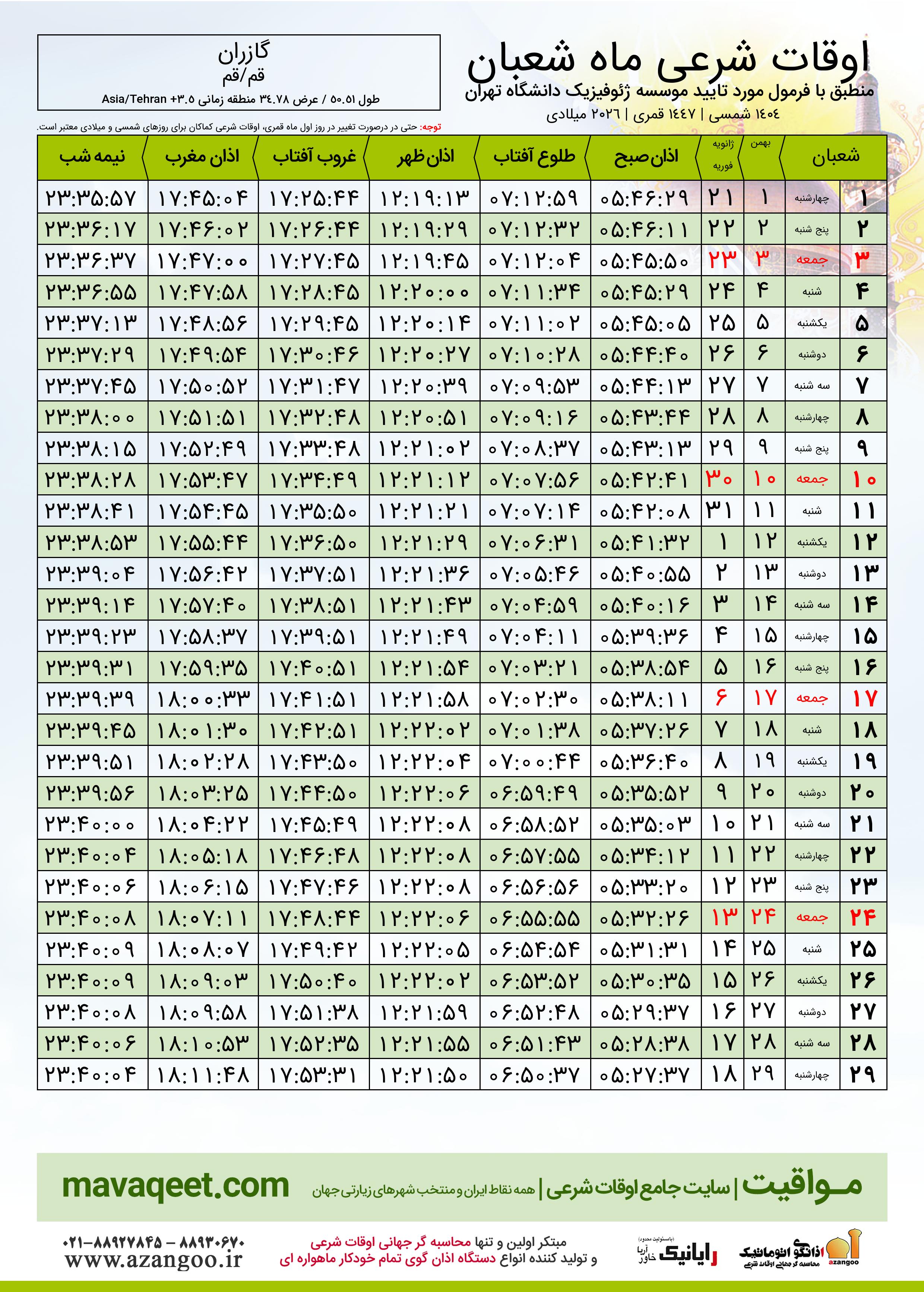 جدول اوقات شرعی شعبان ١٤٤٧ قمری شهر گازران