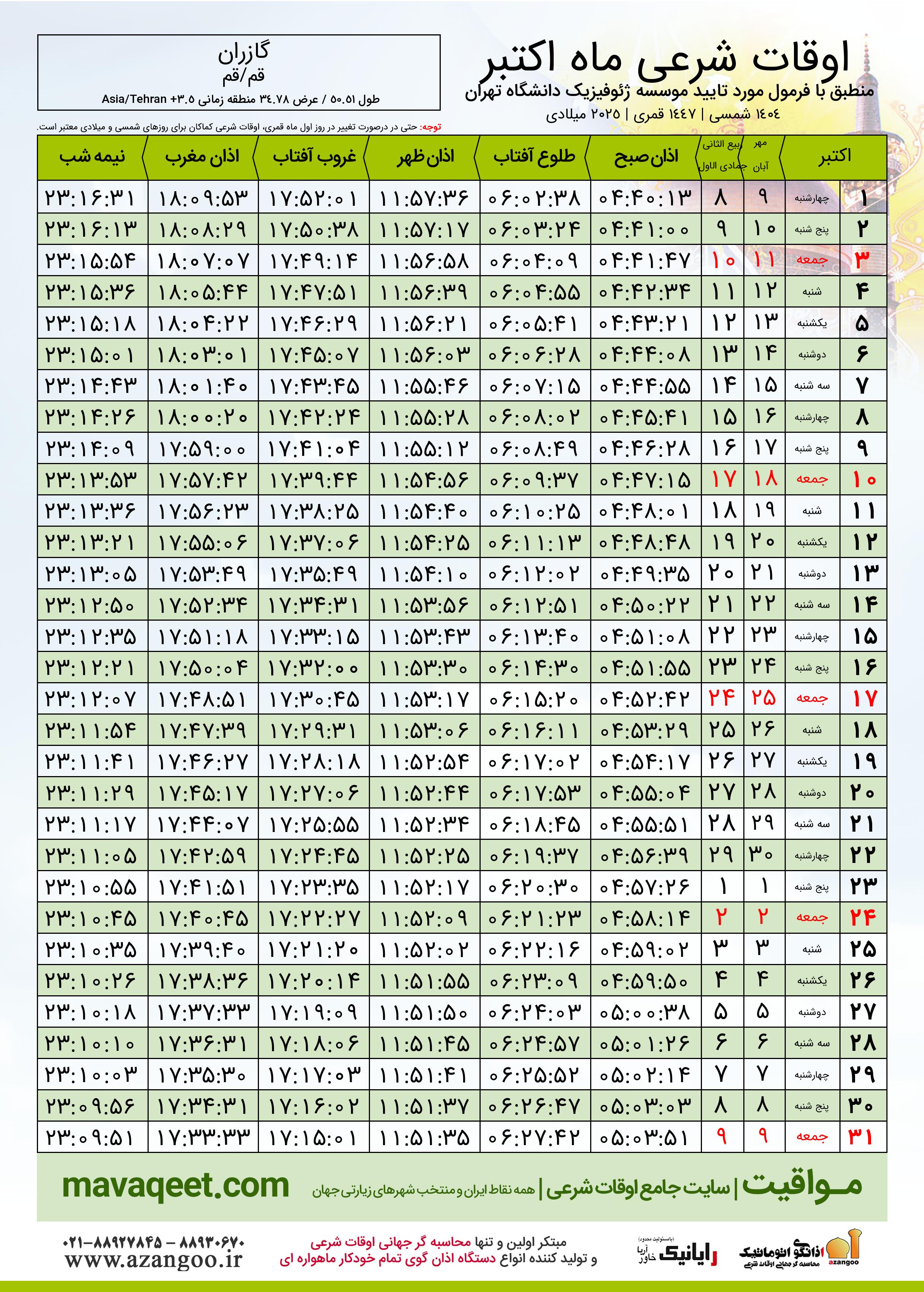 جدول اوقات شرعی اکتبر ٢٠٢٥ میلادی شهر گازران