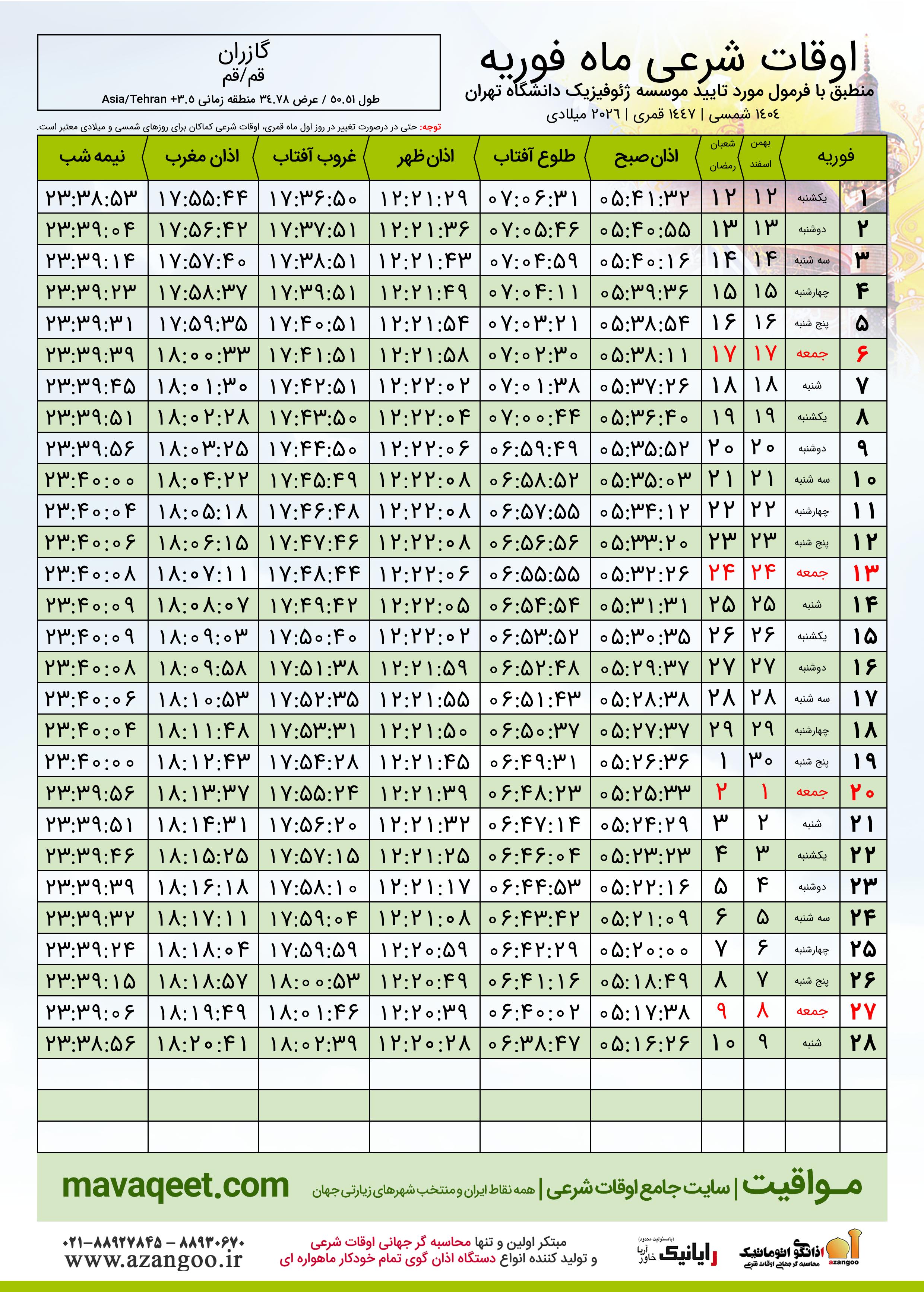 دانلود اوقات شرعی فوریه ٢٠٢٦ شهر گازران