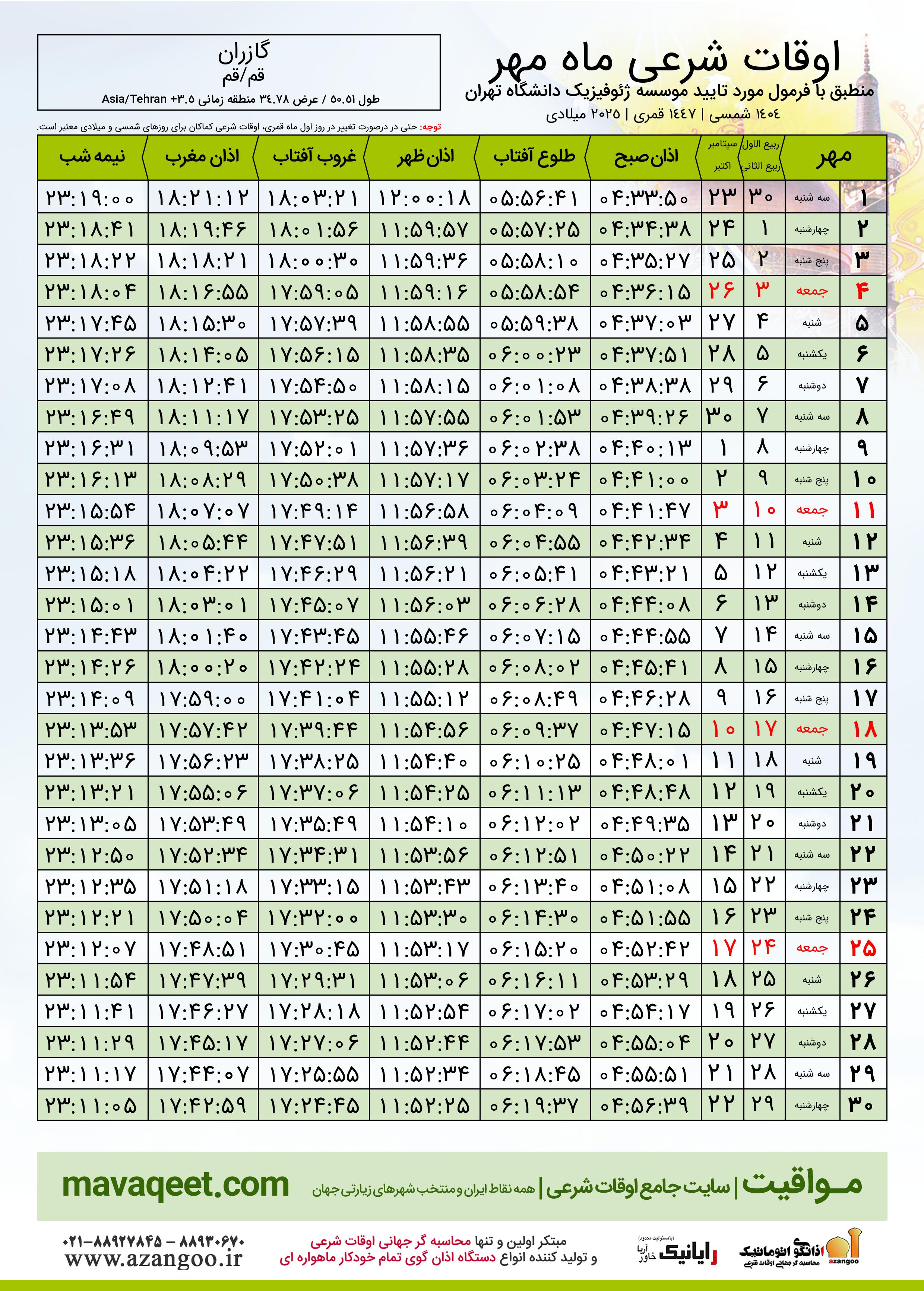 جهت نمایش تصویر جدول اوقات شرعی جدول اوقات شرعی مهر ١٤٠٤ شمسی شهر گازران شهر گازران در اندازه