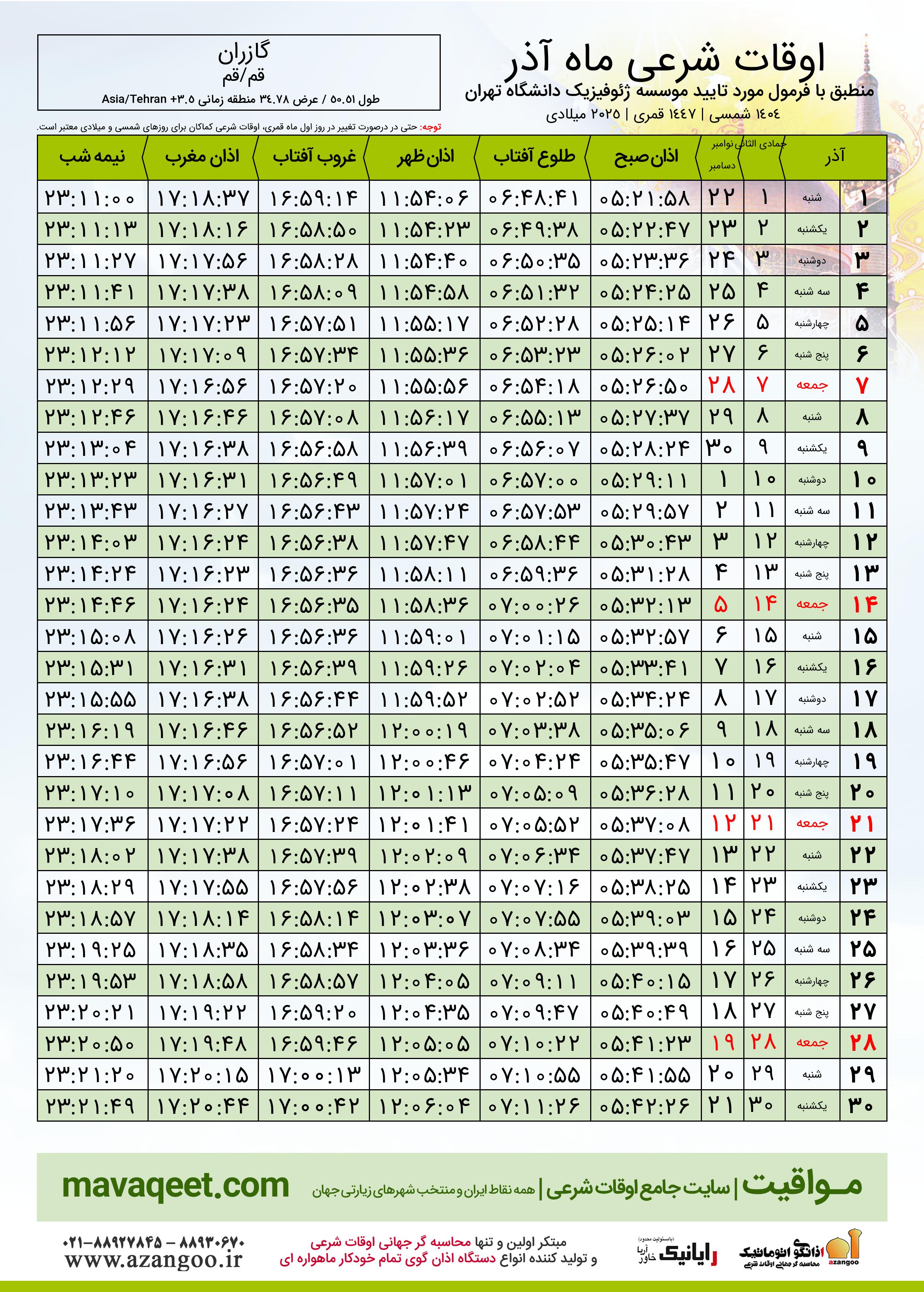 جدول اوقات شرعی آذر ١٤٠٤ شمسی شهر گازران