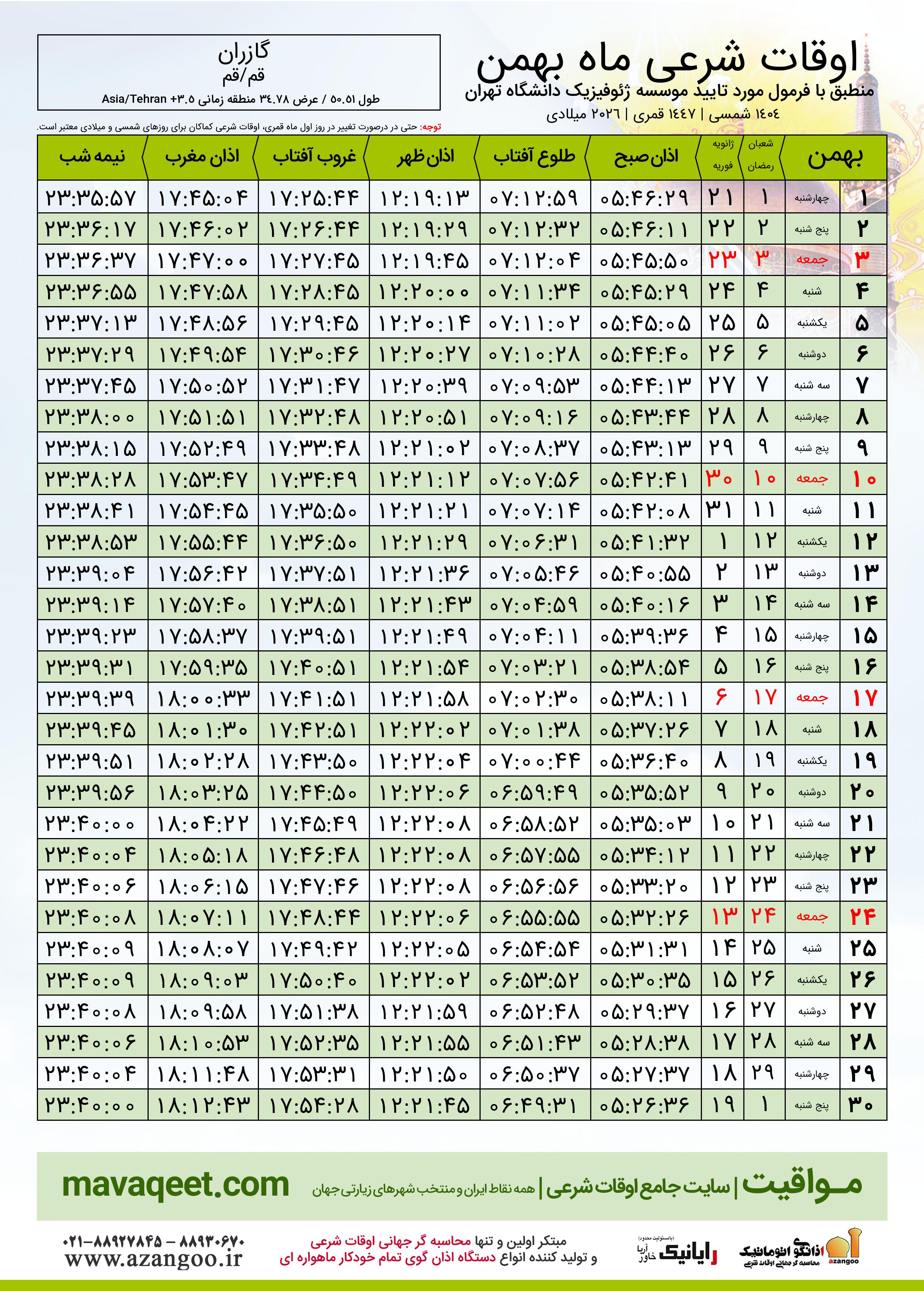 دانلود اوقات شرعی بهمن ٠٤ - ١٤٠٤ شهر گازران
