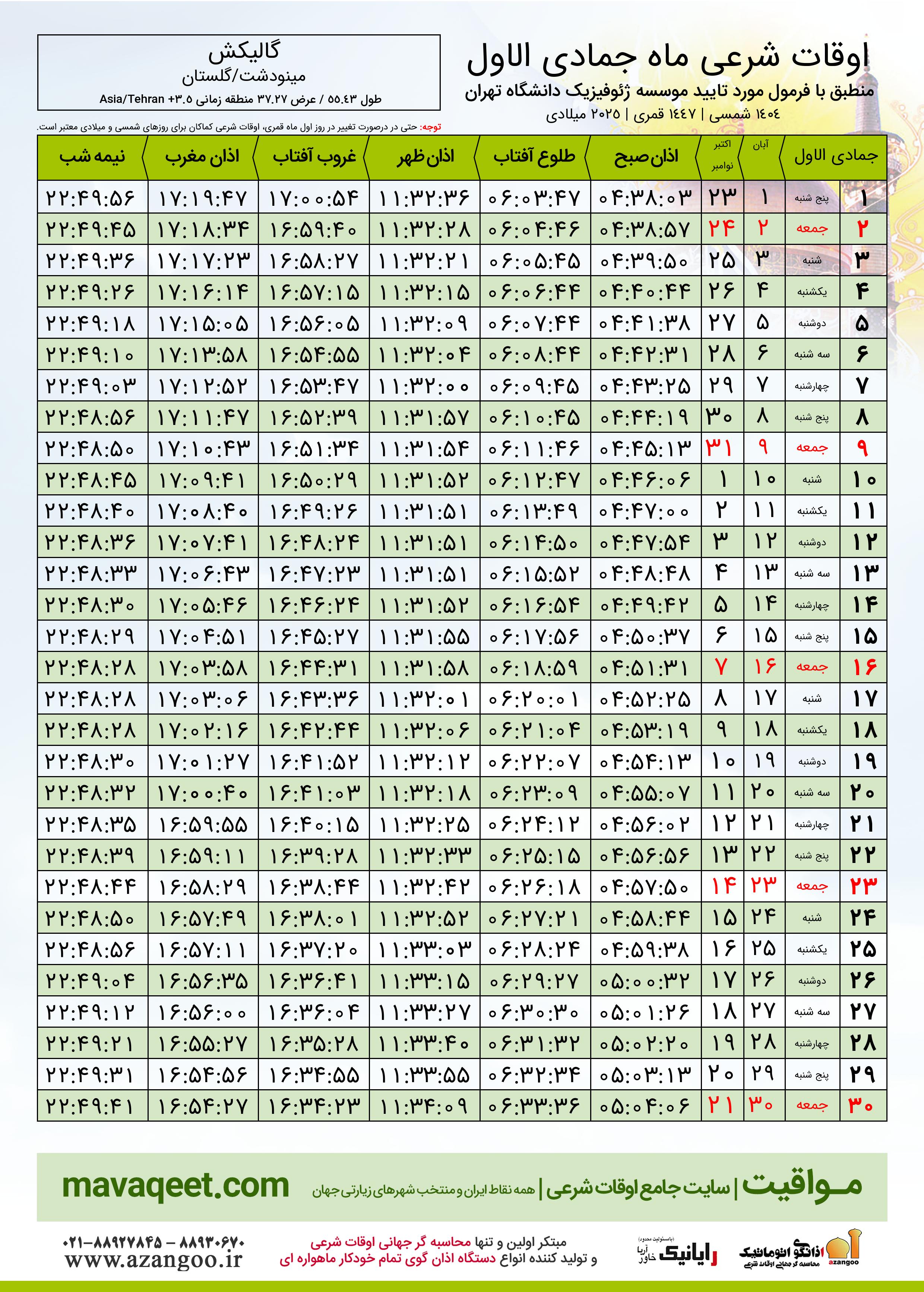 جدول اوقات شرعی جمادی الاول ١٤٤٧ قمری شهر گالیکش