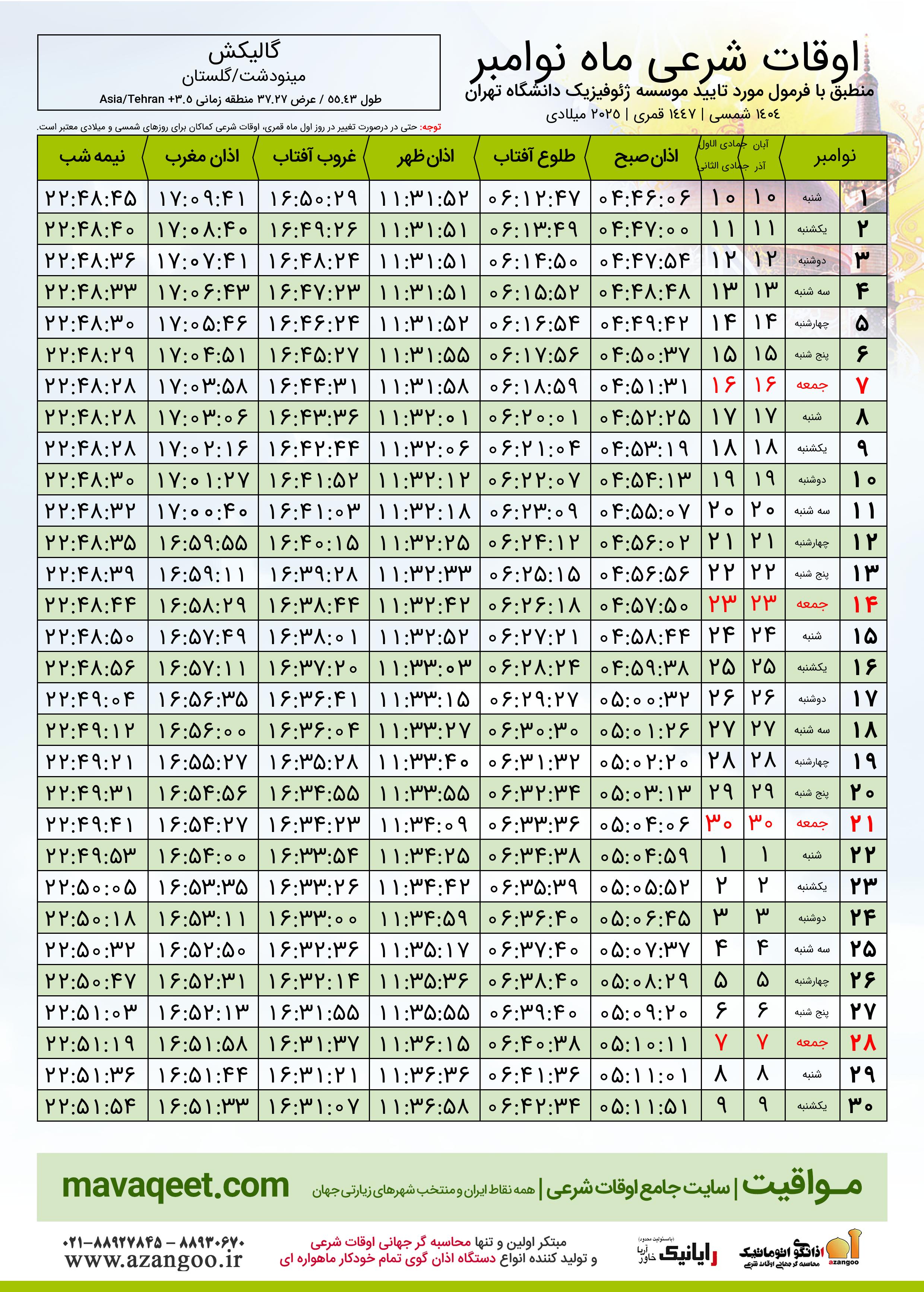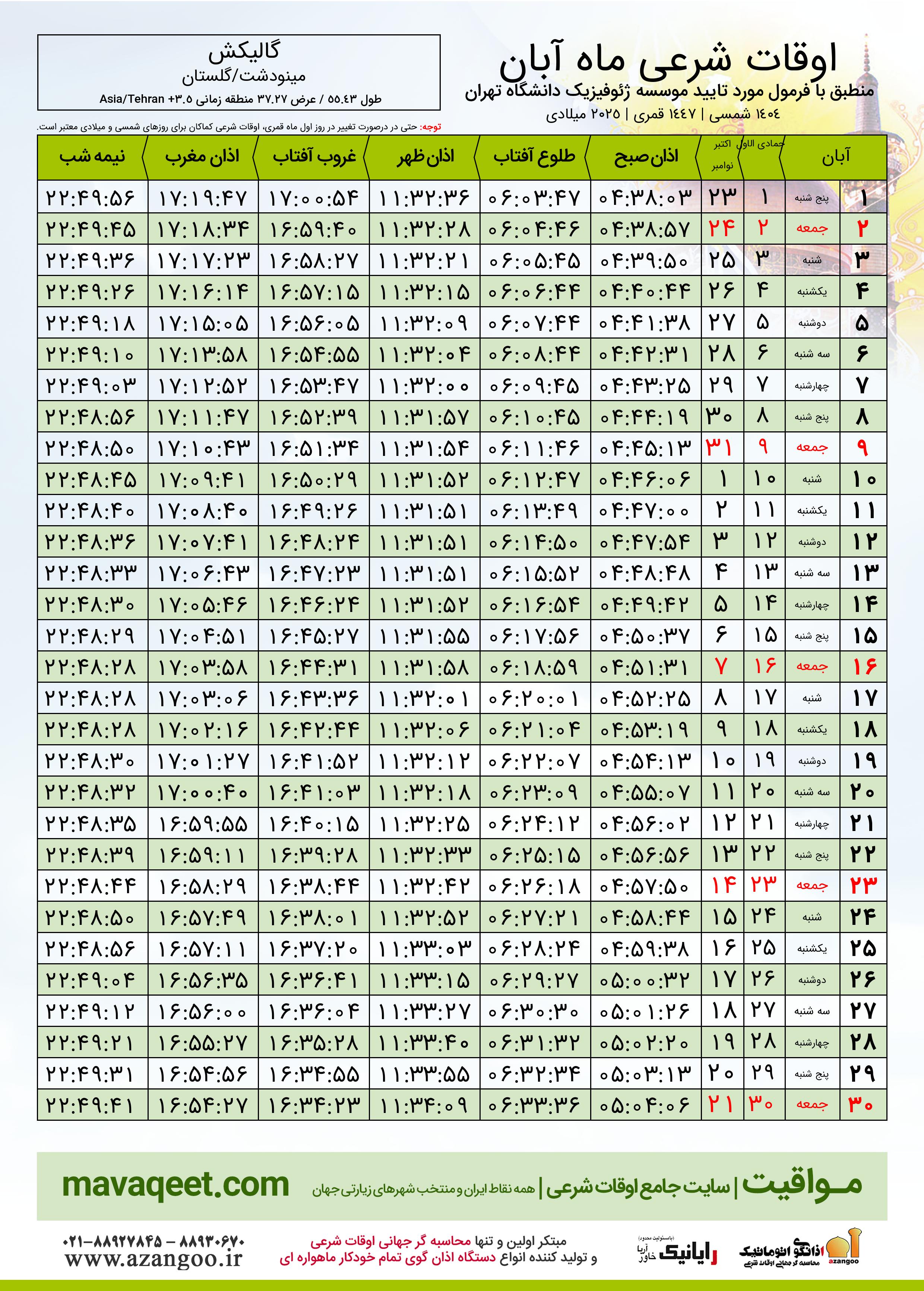 جدول اوقات شرعی آبان ١٤٠٤ شمسی شهر گالیکش