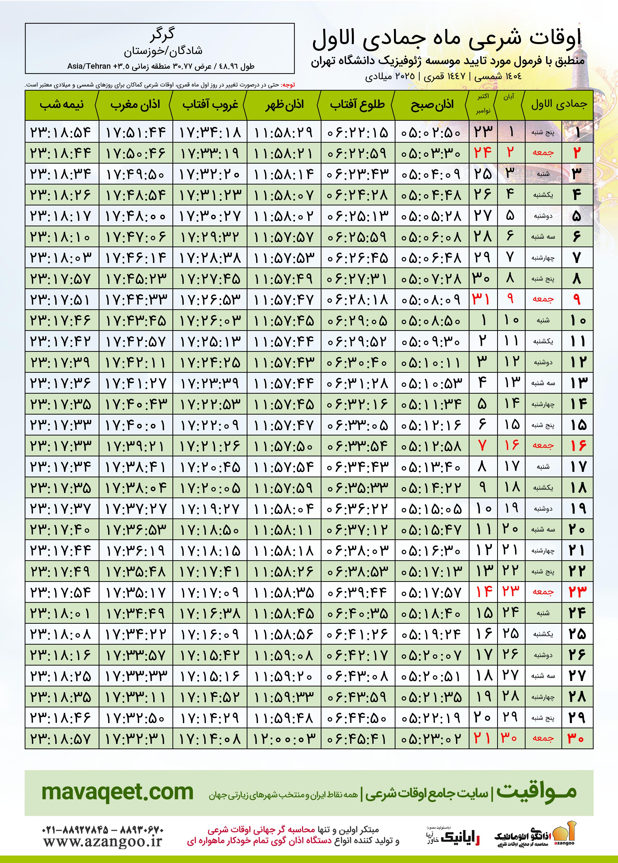 اوقات شرعی ماه جمادی الاول ١٤٤٧ هـ.ق شهر گرگر بر